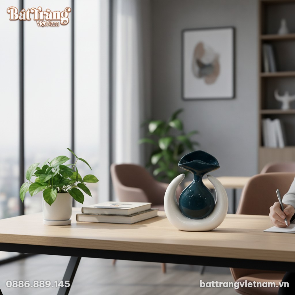 Linh hồn của tác phẩm này nằm ở sự tương phản và hòa quyện. Phần bình gốm trung tâm với sắc xanh thẫm sâu lắng, tượng trưng cho sự tĩnh lặng, trí tuệ và chiều sâu cảm xúc. Màu xanh này, với lớp men bóng mịn đặc trưng của gốm sứ cao cấp, tạo hiệu ứng thị giác ấn tượng, phản chiếu ánh sáng một cách mê hoặc, làm nổi bật phong cách tinh tế của gia chủ.