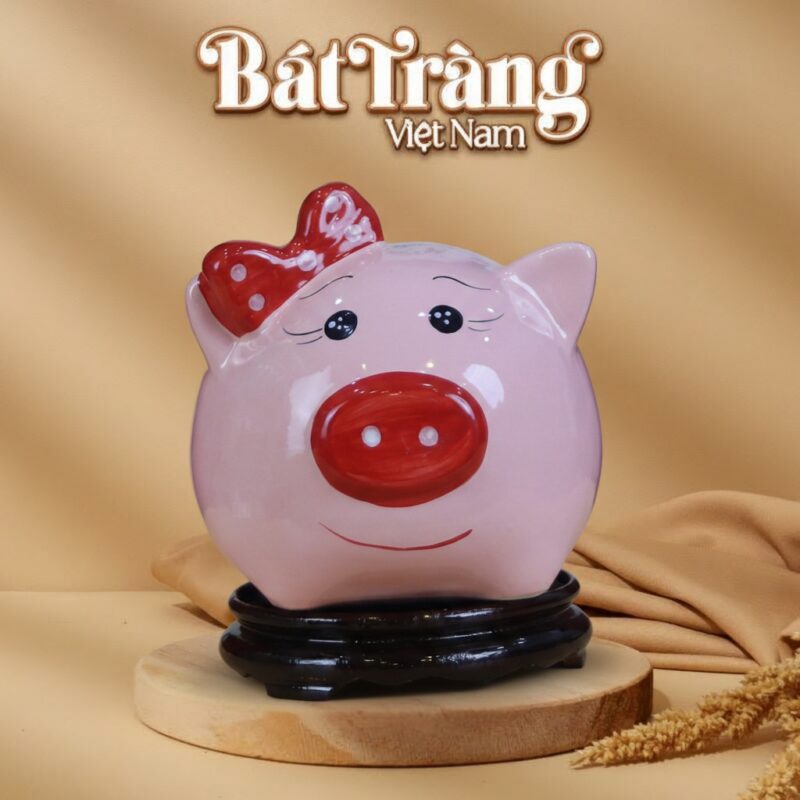 Mỗi chi tiết trên chú heo hồng đều được các nghệ nhân Bát Tràng chăm chút tỉ mỉ, từ chiếc nơ đỏ chấm bi duyên dáng đến đôi mắt đen láy và nụ cười tươi tắn. Sự kết hợp giữa nét truyền thống và phong cách hiện đại tạo nên một sản phẩm vừa gần gũi vừa độc đáo.