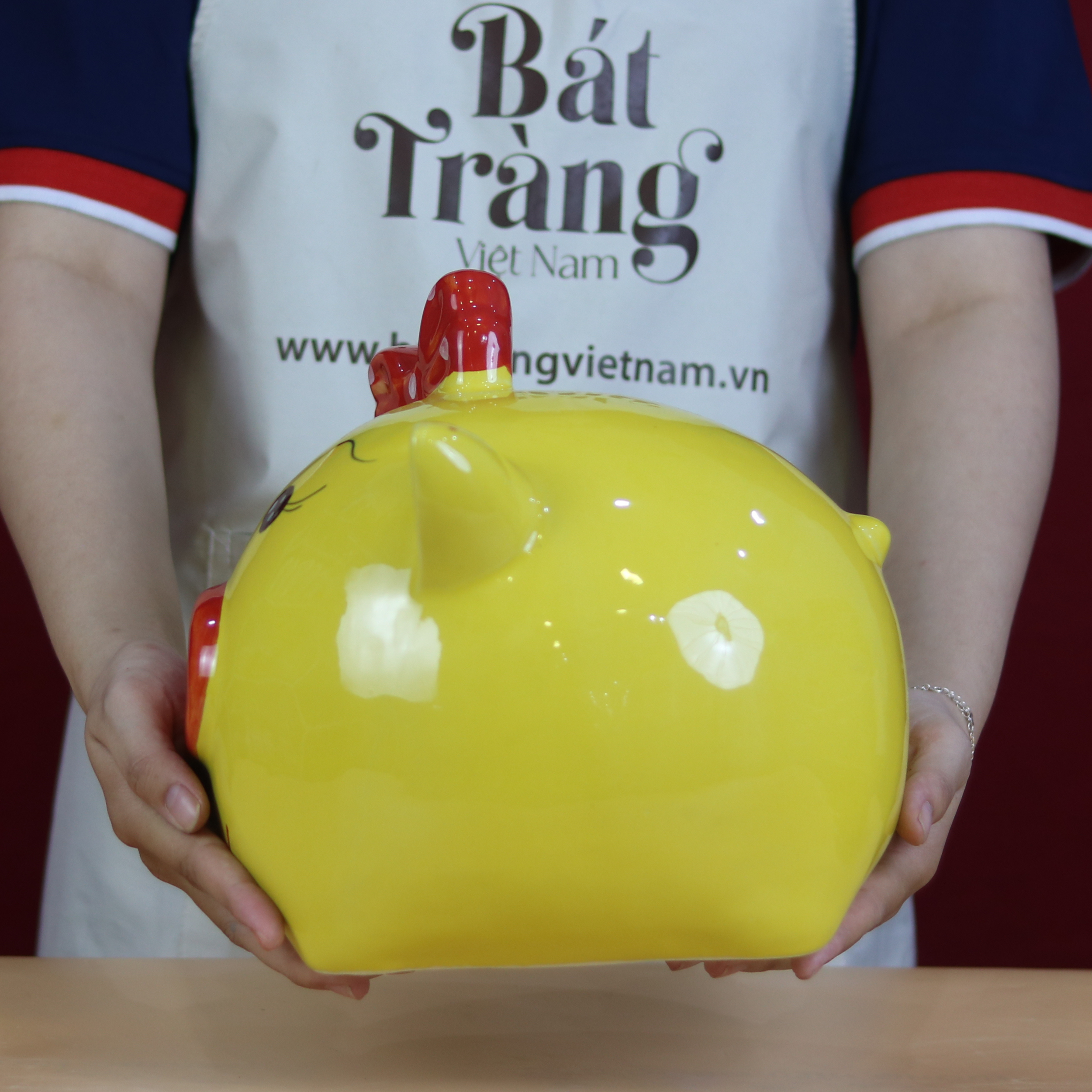 Màu vàng chủ đạo, tươi sáng và rạng rỡ, kết hợp hài hòa với chi tiết đỏ của nơ và mũi, đen của mắt, cùng những chấm bi trắng tinh nghịch. Bề mặt men bóng bẩy không chỉ tôn lên vẻ đẹp hiện đại mà còn rất dễ dàng lau chùi, giữ cho chú heo luôn sáng đẹp như mới. Sản phẩm đi kèm đế gỗ chắc chắn, giúp chú heo đứng vững và thêm phần trang trọng.