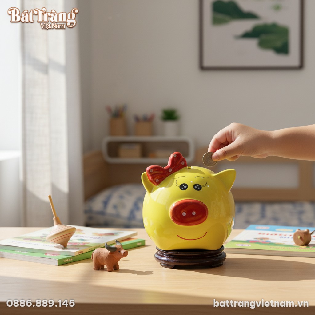 Trong dòng sản phẩm heo đất và ống tiết kiệm tại Gốm Bát Tràng Việt Nam, mỗi chú heo đều mang trong mình một sứ mệnh đặc biệt: trở thành người bạn đồng hành giúp trẻ em học hỏi giá trị của tiền bạc và sự kiên nhẫn. Ống tiết kiệm heo vàng đeo nơ không chỉ là nơi cất giữ tiền, mà còn là “ngôi nhà của những ước mơ”, nơi mỗi đồng tiền lẻ được gửi gắm đều là một bước gần hơn tới mục tiêu.
