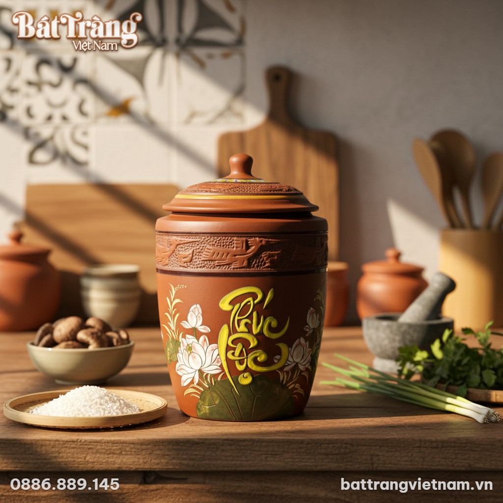 Tại Gốm Bát Tràng Việt Nam (battrangvietnam.vn), chúng tôi tự hào mang đến những sản phẩm gốm sứ Bát Tràng cao cấp, chính gốc, được tuyển chọn kỹ lưỡng và nung ở nhiệt độ cao, đảm bảo an toàn tuyệt đối. Mỗi chiếc Chum Đựng Gạo Chữ “Phúc Lộc” Họa Tiết Sen Hồng là một vật dụng thiết yếu, được tạo tác bằng cả tâm huyết của người nghệ nhân, chứa đựng lời chúc tốt đẹp gửi gắm đến quý khách hàng.