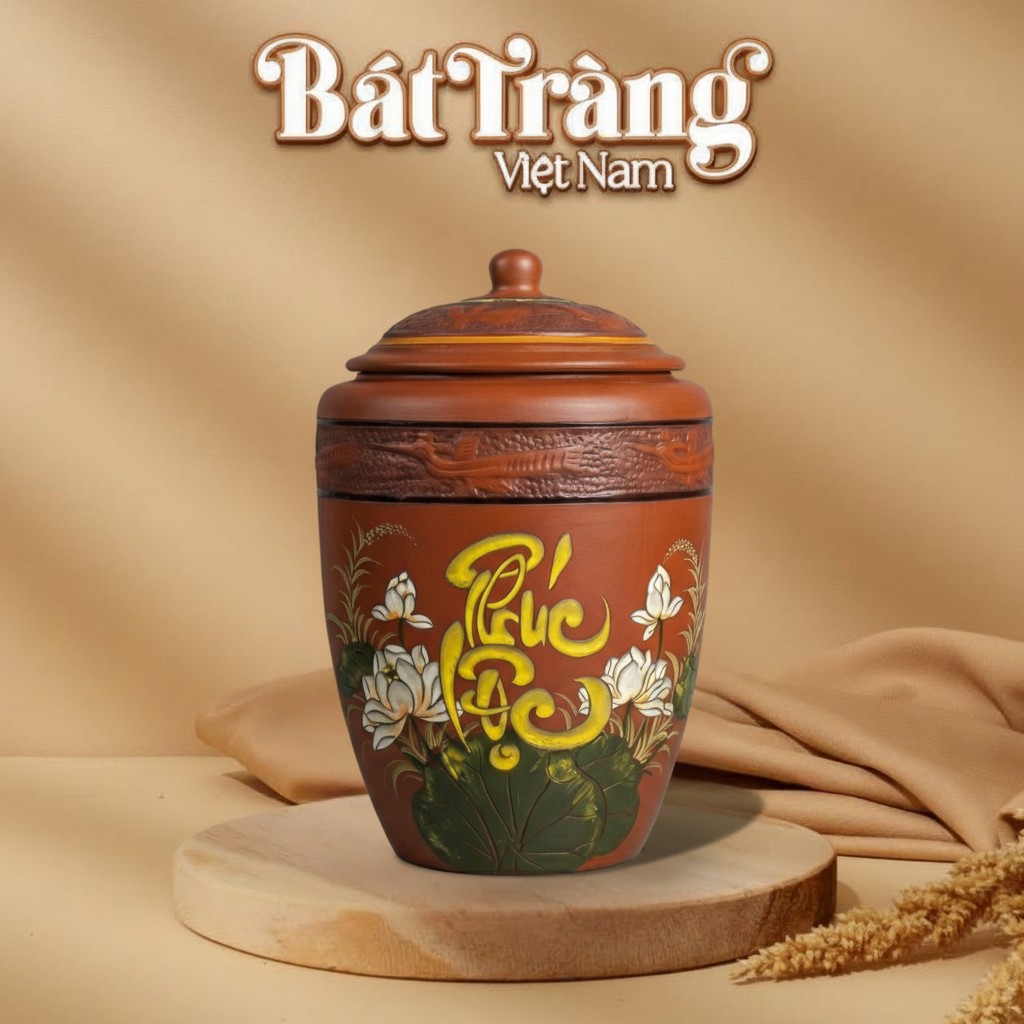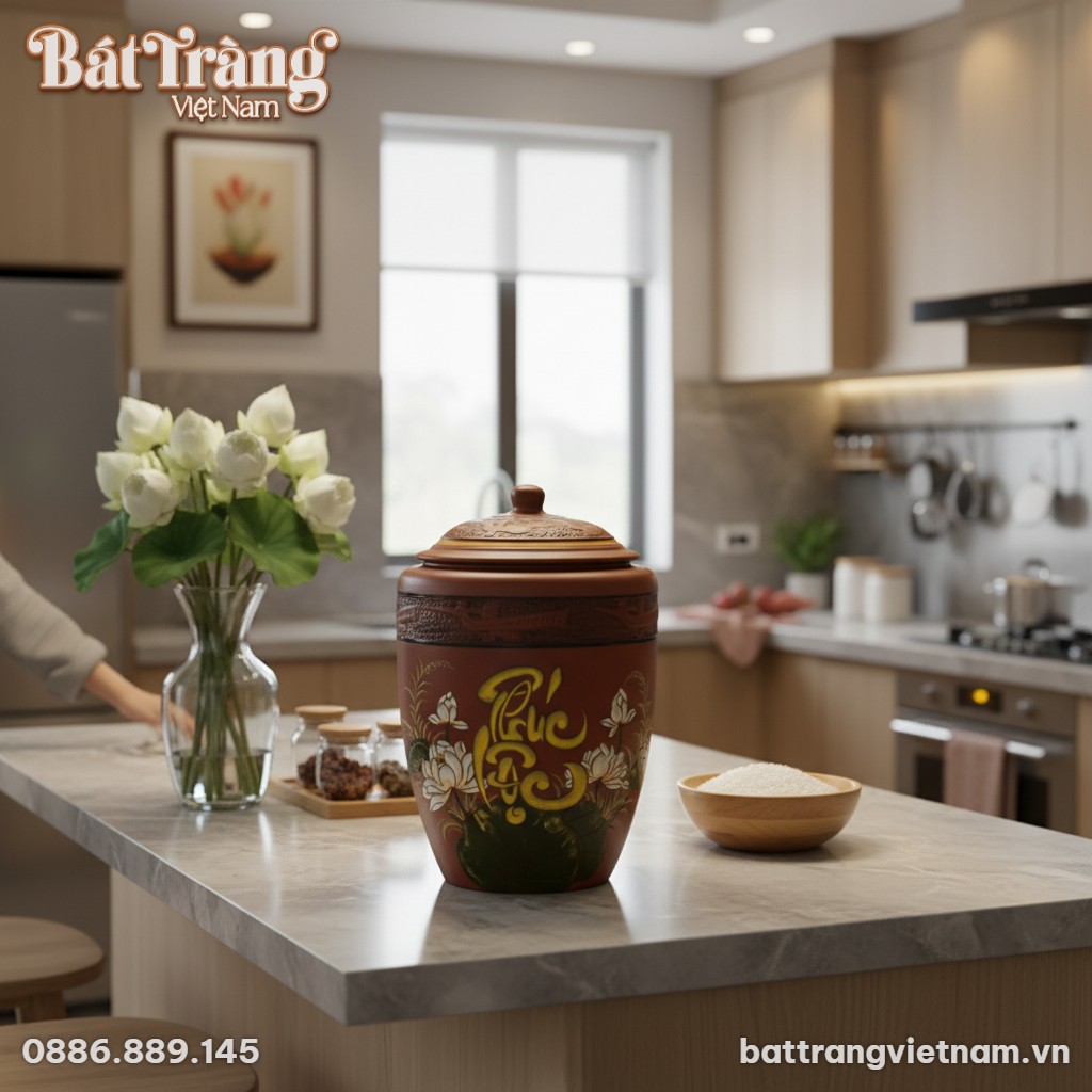 Chiếc hũ này là một vật trang trí đẹp mắt, đồng thời sở hữu công năng bảo quản gạo vượt trội. Với khả năng chứa đến 20KG gạo, sản phẩm đáp ứng nhu cầu sử dụng của các gia đình truyền thống Việt Nam, đảm bảo nguồn lương thực luôn dồi dào.