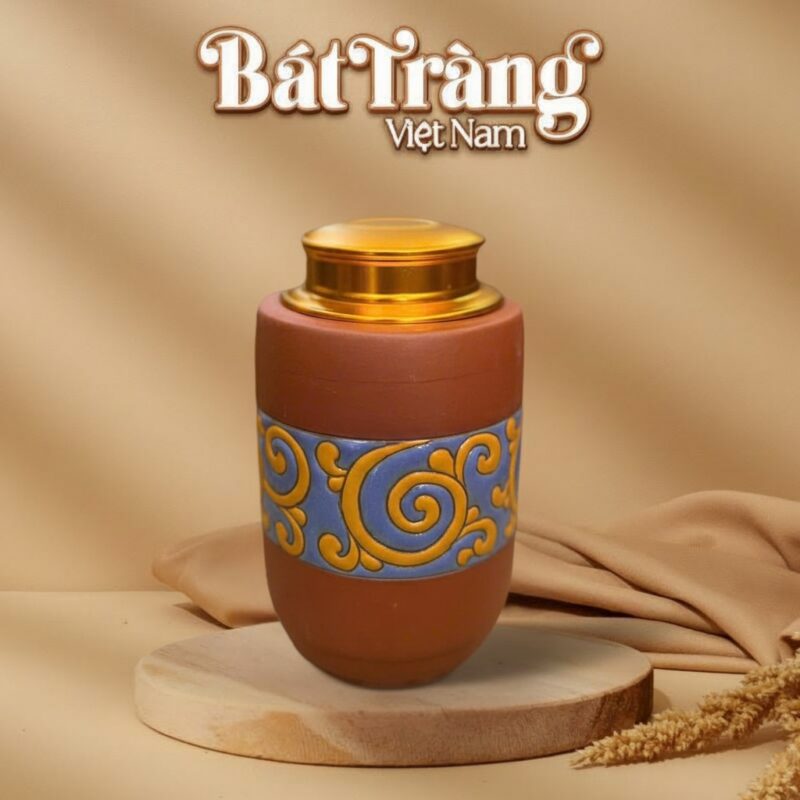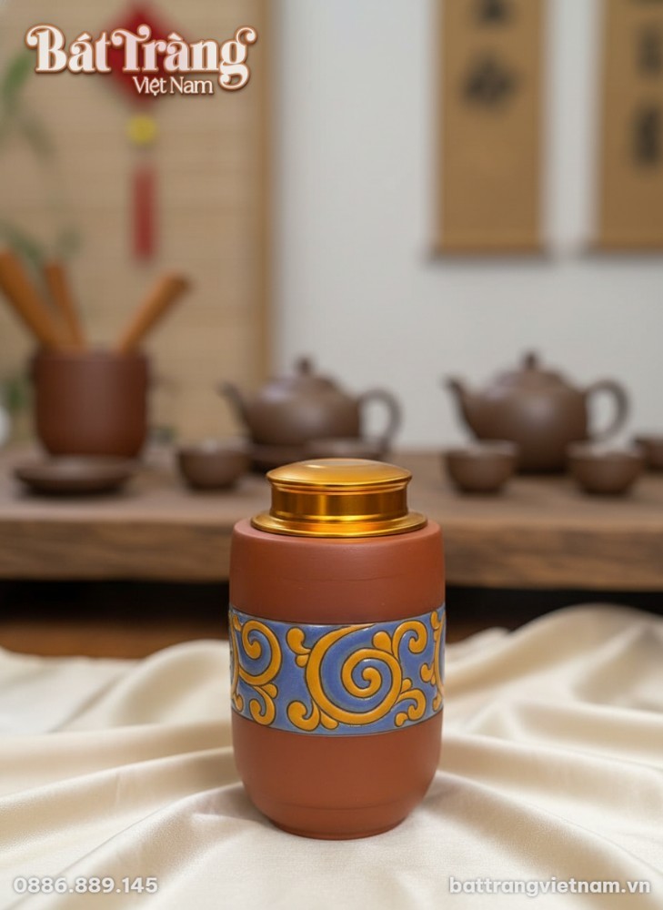Hũ đựng trà gốm đất đỏ Bát Tràng dáng trụ hoạ tiết hoa dây cách điệu BT-HĐT08 là sự kết hợp hoàn hảo giữa chất liệu gốm mộc truyền thống và tư duy thẩm mỹ hiện đại. Nổi bật trên nền đất nung trầm ấm là dải họa tiết hoa dây vàng uốn lượn tinh xảo trên đai xanh, mang lại vẻ đẹp vừa sang trọng vừa cuốn hút. Cùng với thiết kế nắp kín hơi giúp lưu hương trà tuyệt đối, sản phẩm này chắc chắn sẽ là điểm nhấn nghệ thuật nâng tầm đẳng cấp cho không gian bàn trà của gia chủ.