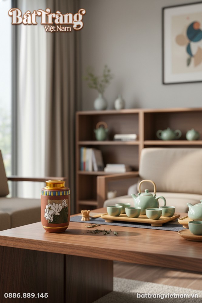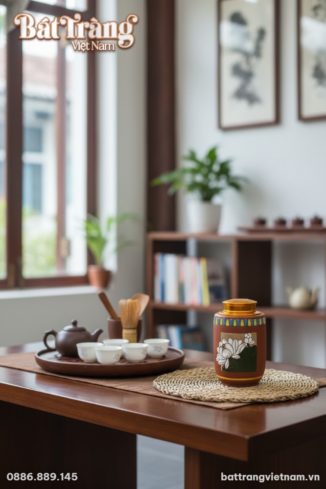 Với vẻ đẹp thanh lịch và ý nghĩa sâu sắc, hũ đựng trà hoạ tiết hoa sen là lựa chọn hoàn hảo để bài trí trong nhiều không gian. Bạn có thể đặt nó trên bàn trà, kệ sách, tủ trưng bày trong phòng khách hoặc phòng làm việc. Chiếc hũ sẽ là điểm nhấn tinh tế, mang đến sự bình yên, thanh tịnh và một chút hơi thở Á Đông vào ngôi nhà của bạn.