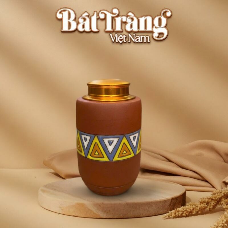 Các họa tiết tam giác được phủ lớp men bóng nhẹ, khác biệt hoàn toàn với thân hũ men mộc. Sự đối lập về chất men này không những tạo chiều sâu cho sản phẩm mà còn làm nổi bật từng đường nét, khiến chiếc hũ trở thành một điểm nhấn nghệ thuật thực thụ trong mọi không gian. Đây chính là minh chứng cho sự sáng tạo không ngừng của những người thợ làm hũ trà gốm sứ Bát Tràng.
