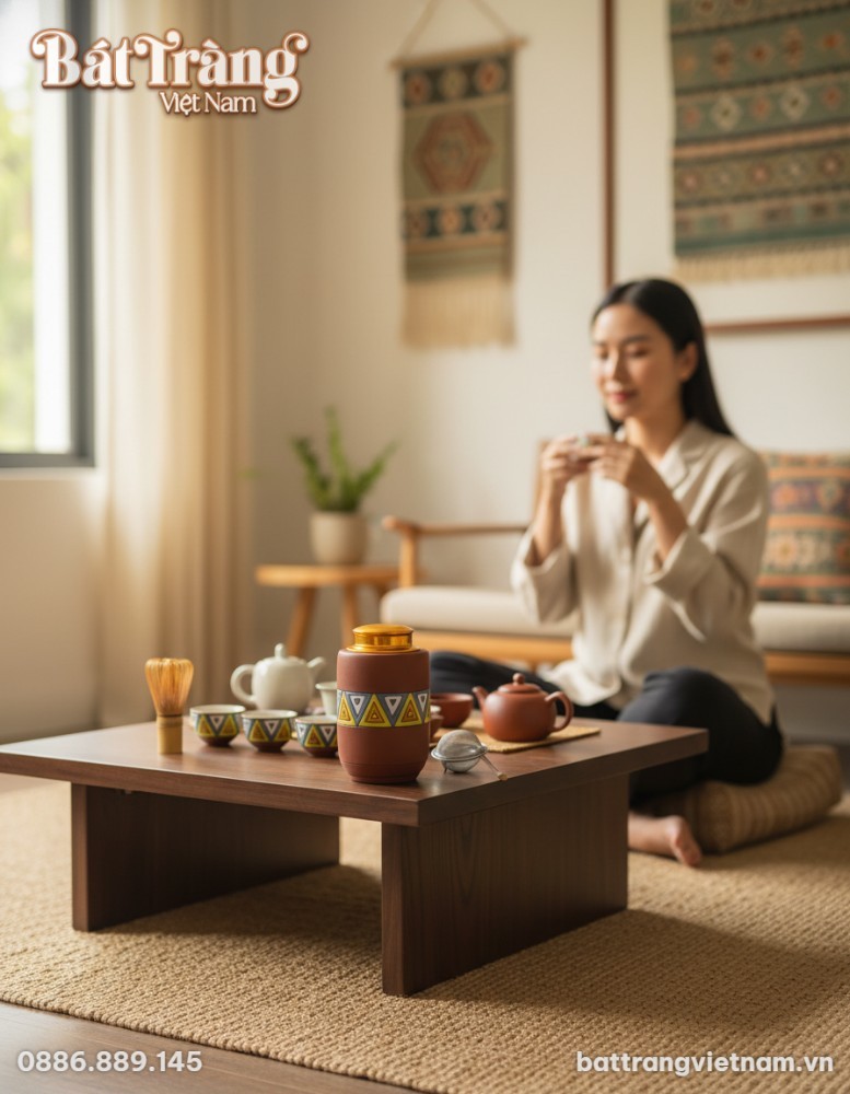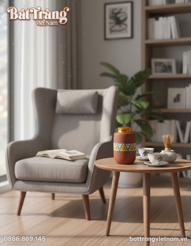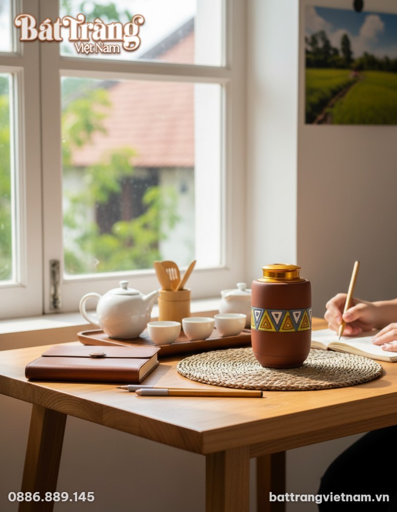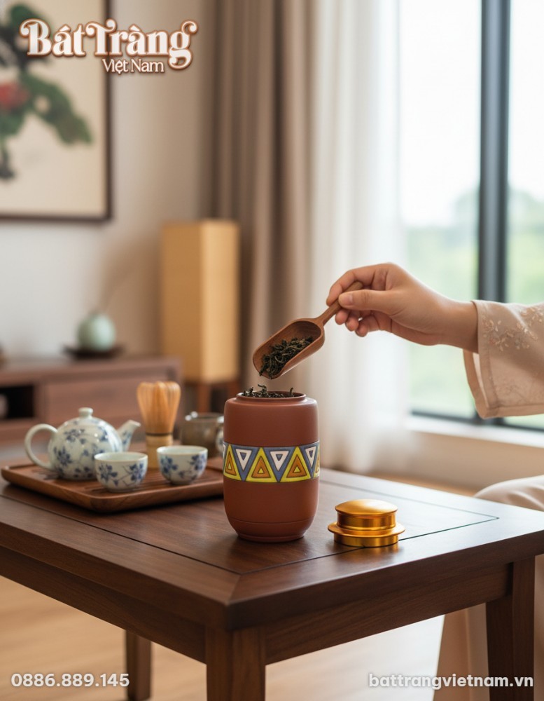 Bên cạnh công năng chính, chiếc hũ còn là một vật trang trí độc đáo. Gia chủ có thể đặt nó ở phòng khách, trên bàn làm việc, hoặc góc đọc sách để tạo thêm nét ấm cúng, tinh tế. Hũ trà hòa mình vào nhiều phong cách nội thất, từ hiện đại pha bohemian đến mộc mạc, dân gian. Sản phẩm này còn là món quà ý nghĩa, thể hiện sự quan tâm và gu thẩm mỹ của người tặng.