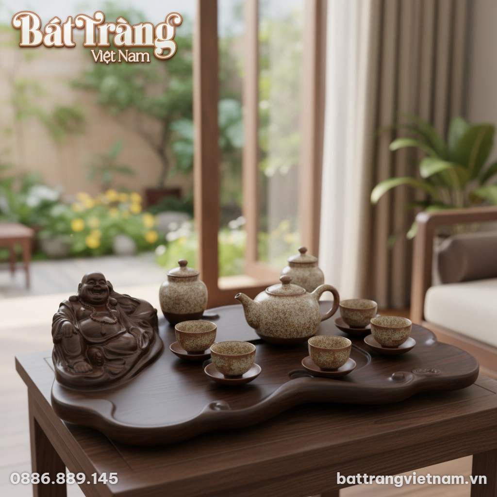 Việc bài trí một chiếc khay trà gỗ tự nhiên có họa tiết tâm linh giúp gia chủ tìm thấy sự thư thái và nhẹ lòng trong mỗi nhịp pha trà. Hình tượng Ngài ngự trên áng mây không chỉ kiến tạo vẻ đẹp thẩm mỹ mà còn gửi gắm mong cầu về vượng khí và bình an, giúp buổi đàm đạo thêm phần trang trọng và ý nghĩa.
