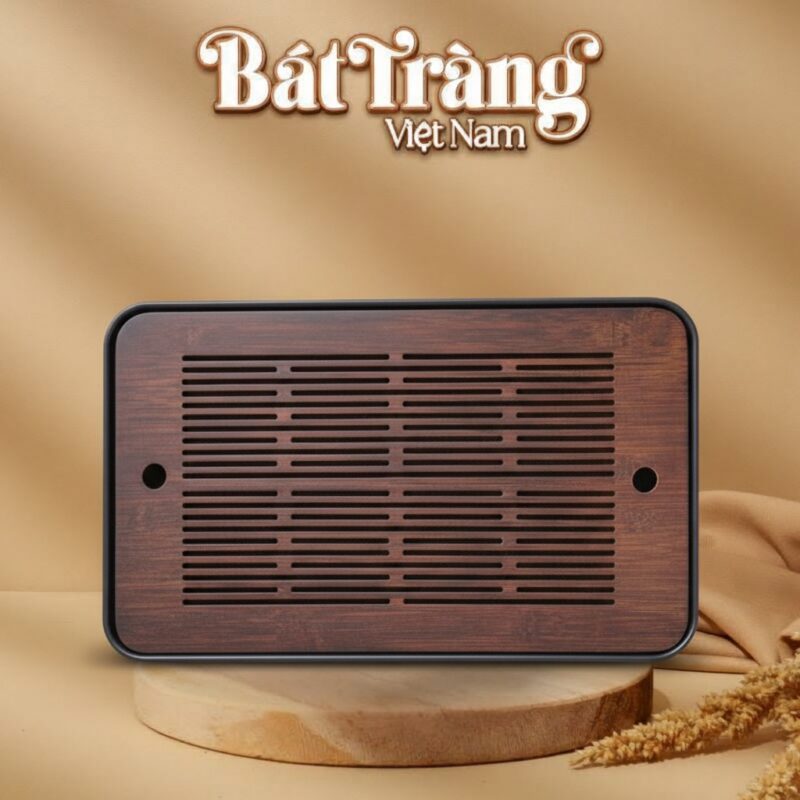 Sản phẩm có cấu tạo 2 phần tách biệt thông minh. Mặt nắp trên làm từ tre già đã qua xử lý chống mối mọt, đảm bảo độ cứng cáp. Phần đế hứng nước bên dưới được chế tác từ vật liệu nhựa cao cấp màu đen tuyền. Sự kết hợp này giúp khay có trọng lượng nhẹ, khả năng chứa nước tuyệt đối và cực kỳ bền bỉ theo thời gian.