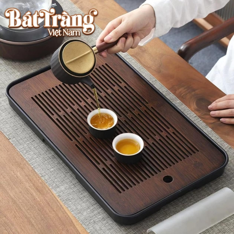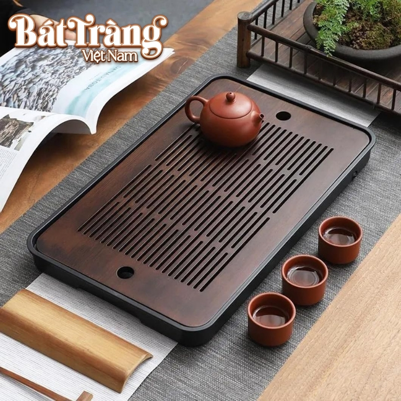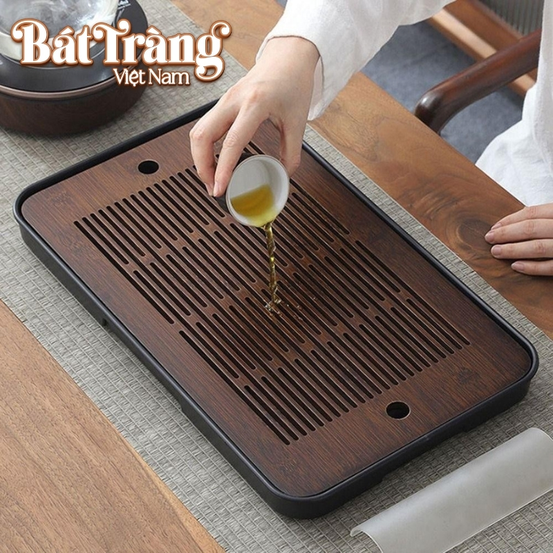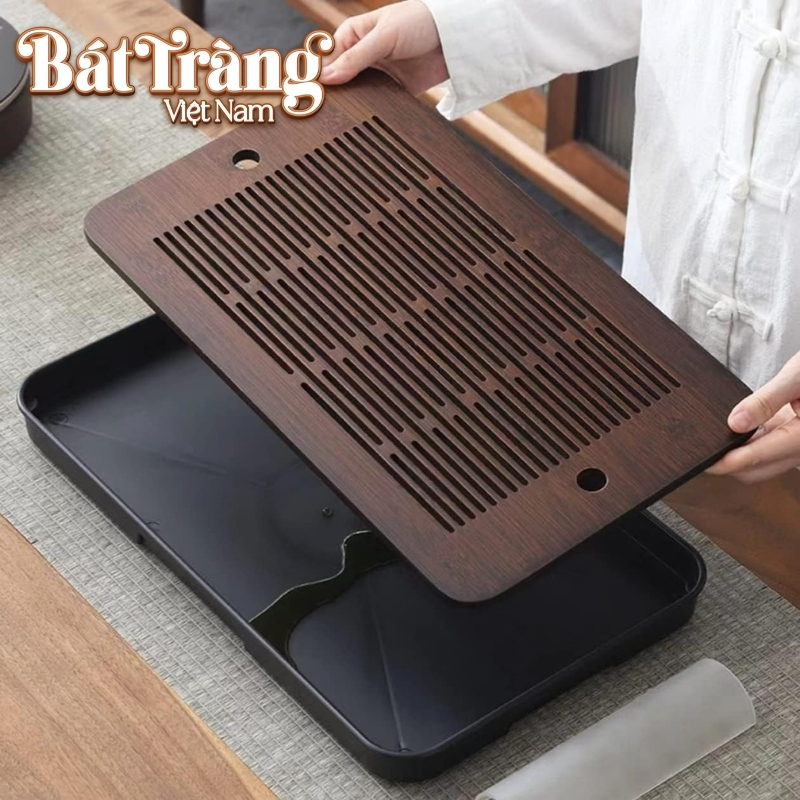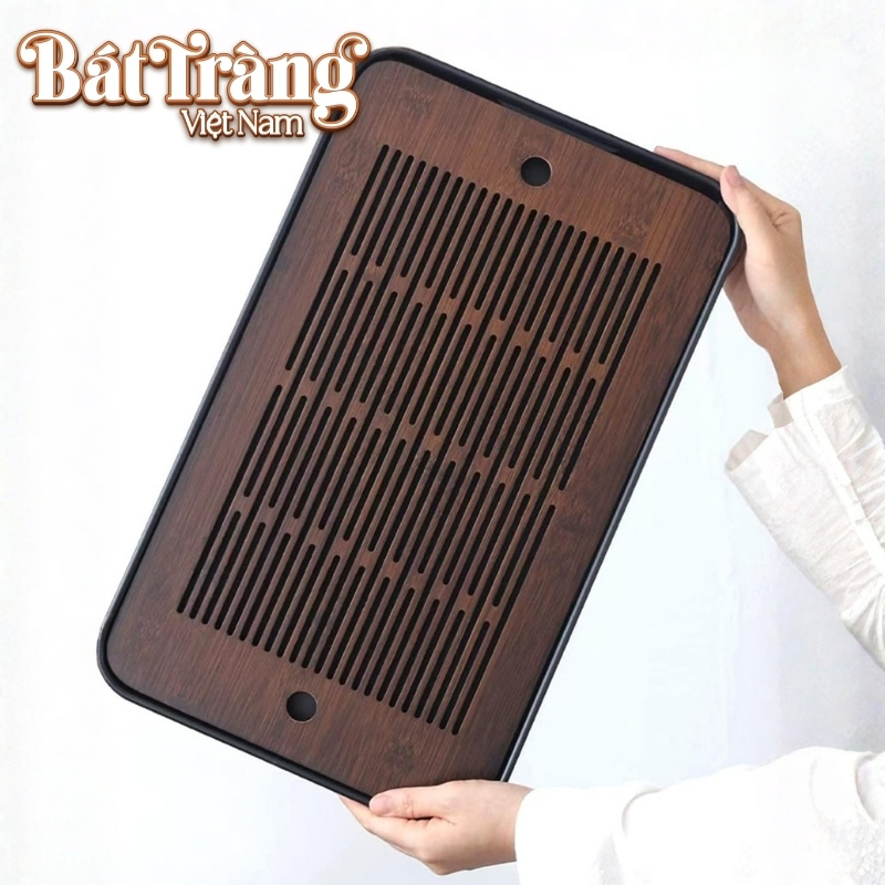 Bề mặt khay được thiết kế với các khe thoát nước trải dài, giúp nước tráng ấm hay nước thừa trôi đi ngay lập tức, giữ cho khu vực pha trà luôn khô ráo.