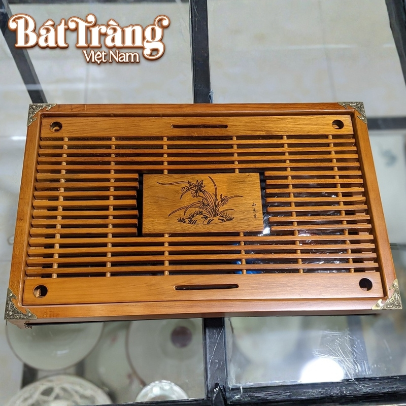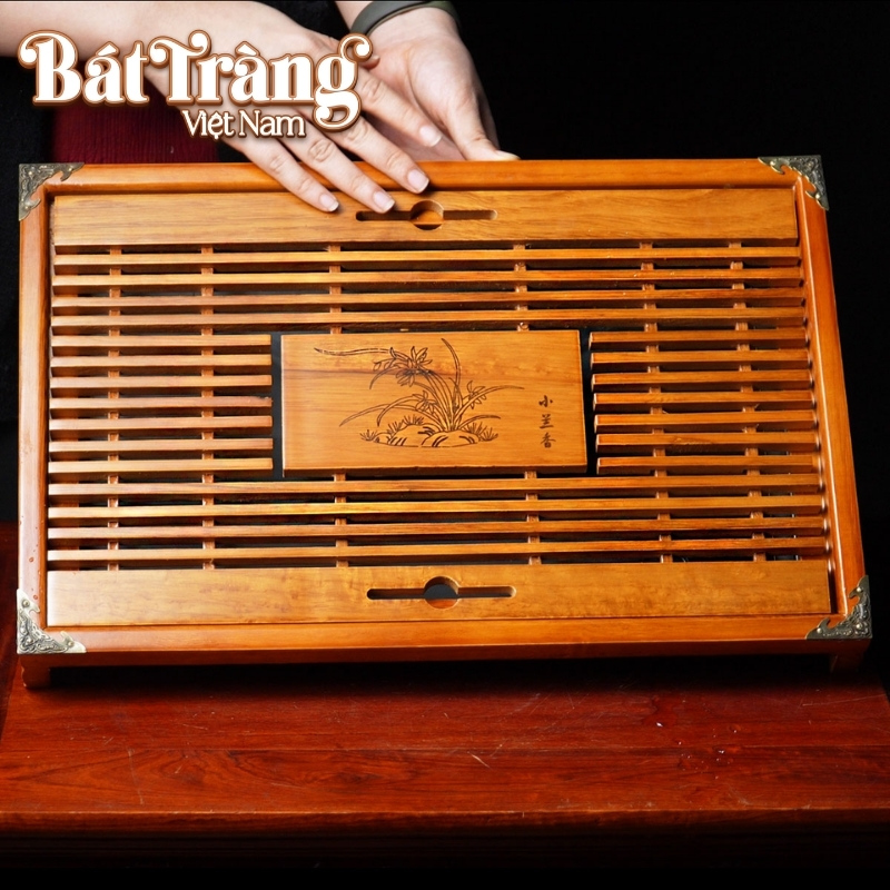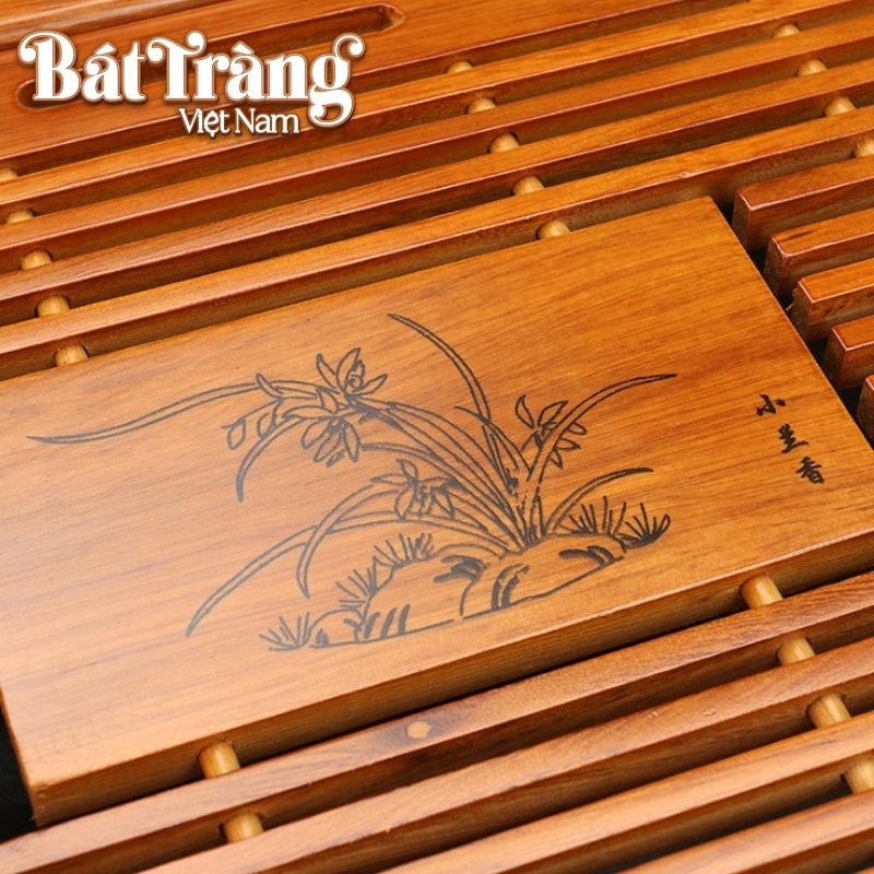 Điểm nhấn thẩm mỹ của sản phẩm nằm ở bức họa hoa lan được khắc CNC sắc nét ngay tại trung tâm mặt khay, kèm theo vài nét chữ Hán mềm mại. Trong văn hóa Á Đông, hoa lan là biểu tượng của sự thanh cao, nhã nhặn và khí tiết của người quân tử. Hình ảnh nhành lan vươn mình giữa những nan tre kiến tạo vẻ đẹp đầy chất thơ cho bộ trà cụ.