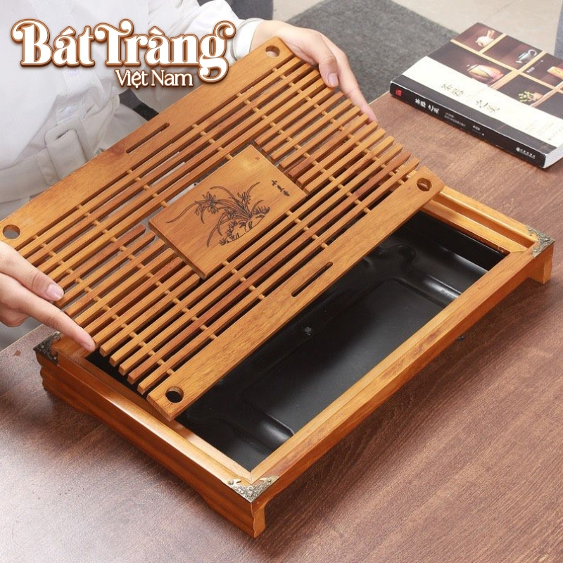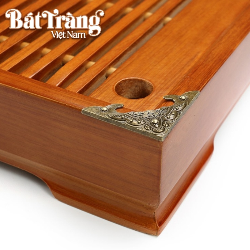 Với kích thước 43x28x6cm, mẫu khay này đủ rộng rãi để bài trí một bộ ấm cùng 6 chén trà nhưng vẫn giữ được sự gọn gàng trên mặt bàn. Hai lỗ tròn nhỏ tại góc khay giúp quý khách dễ dàng đưa ngón tay vào để nhấc mặt tre lên, mang lại sự tiện nghi trong suốt buổi đàm đạo.