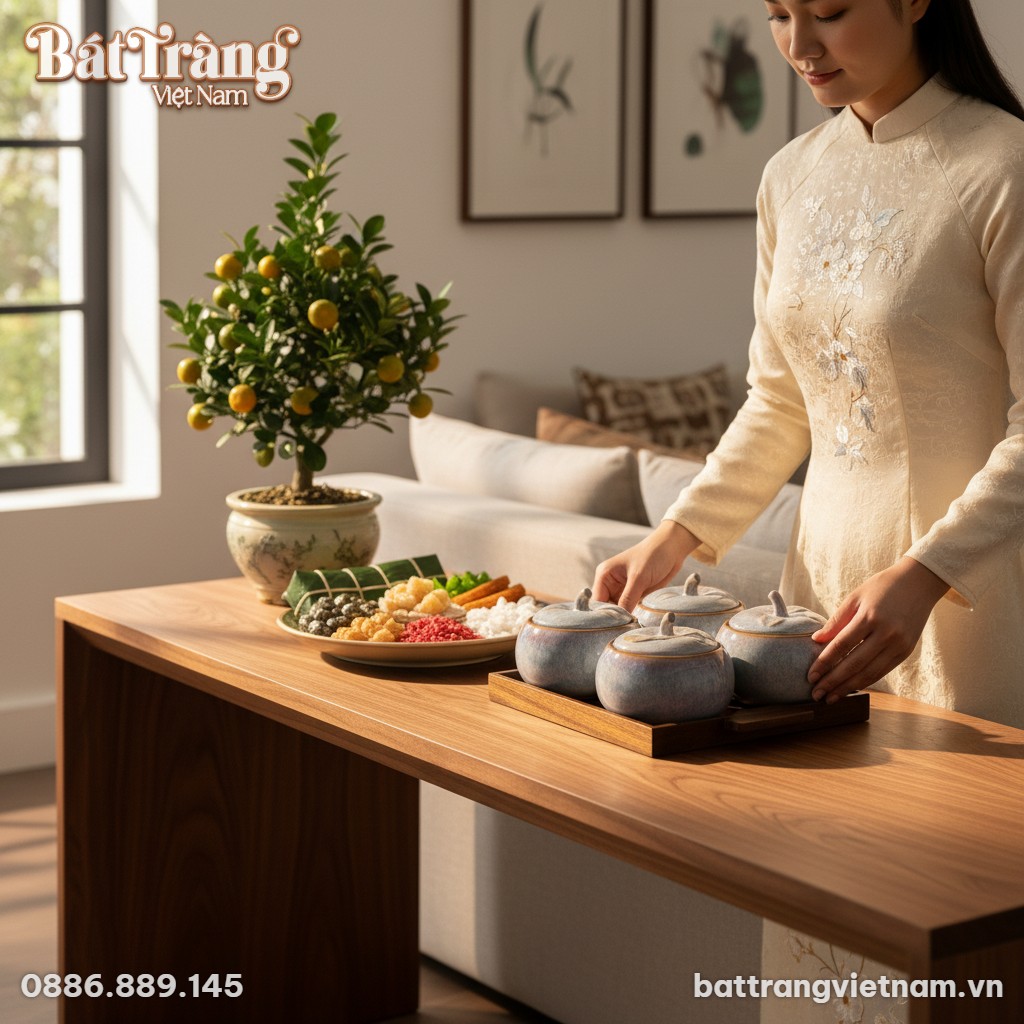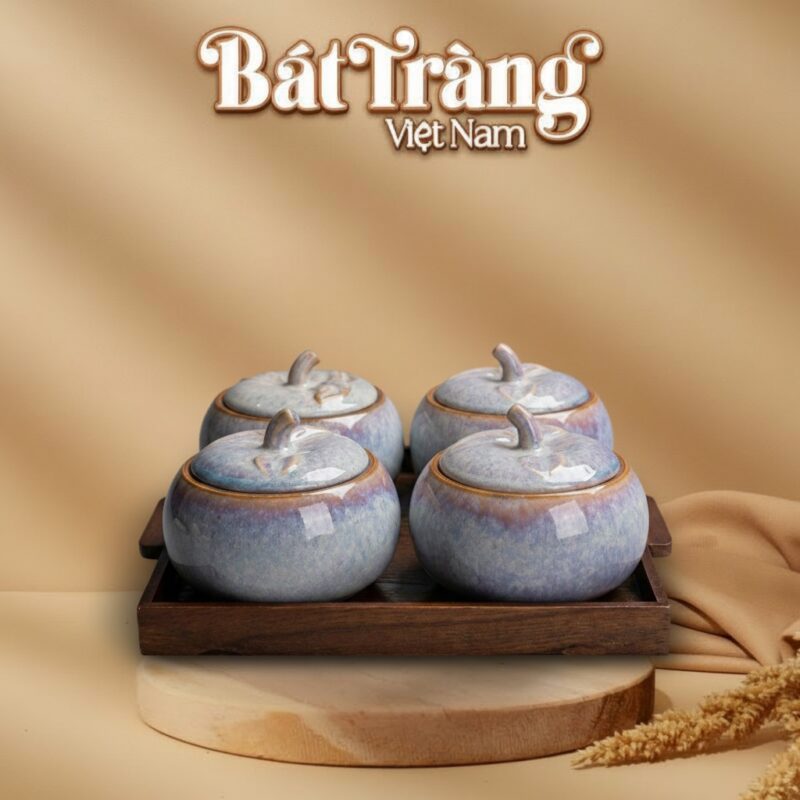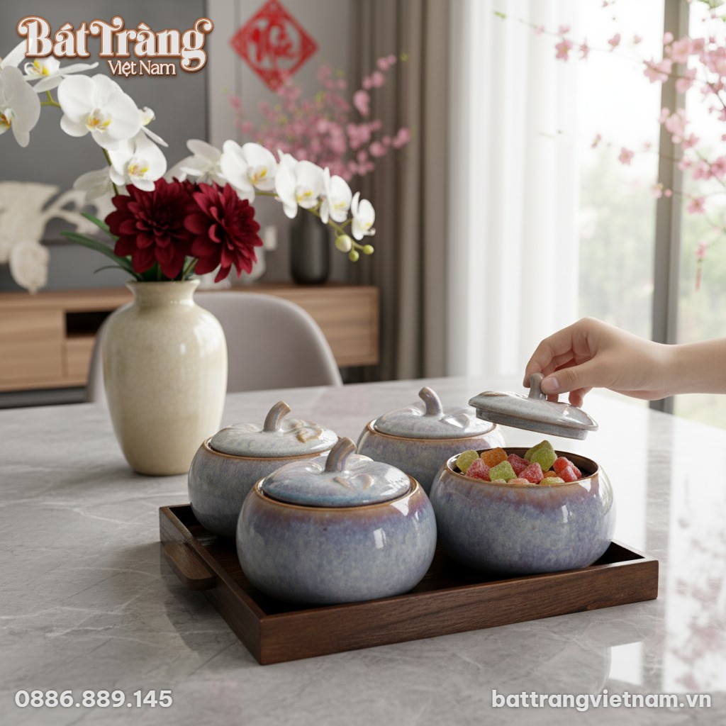 Trong vô vàn lựa chọn cho không gian Tết, các sản phẩm hũ mứt Bát Tràng luôn chiếm một vị trí đặc biệt bởi giá trị văn hóa và nghệ thuật sâu sắc. Bộ hũ này nổi bật với lớp men hỏa biến màu xanh lam tím đầy mê hoặc, tạo nên những đường vân và sắc độ chuyển mình tự nhiên, không hũ nào giống hũ nào. Đây chính là yếu tố làm nên sự độc bản, biến mỗi sản phẩm thành một tác phẩm nghệ thuật duy nhất, thể hiện gu thẩm mỹ tinh tế của gia chủ.