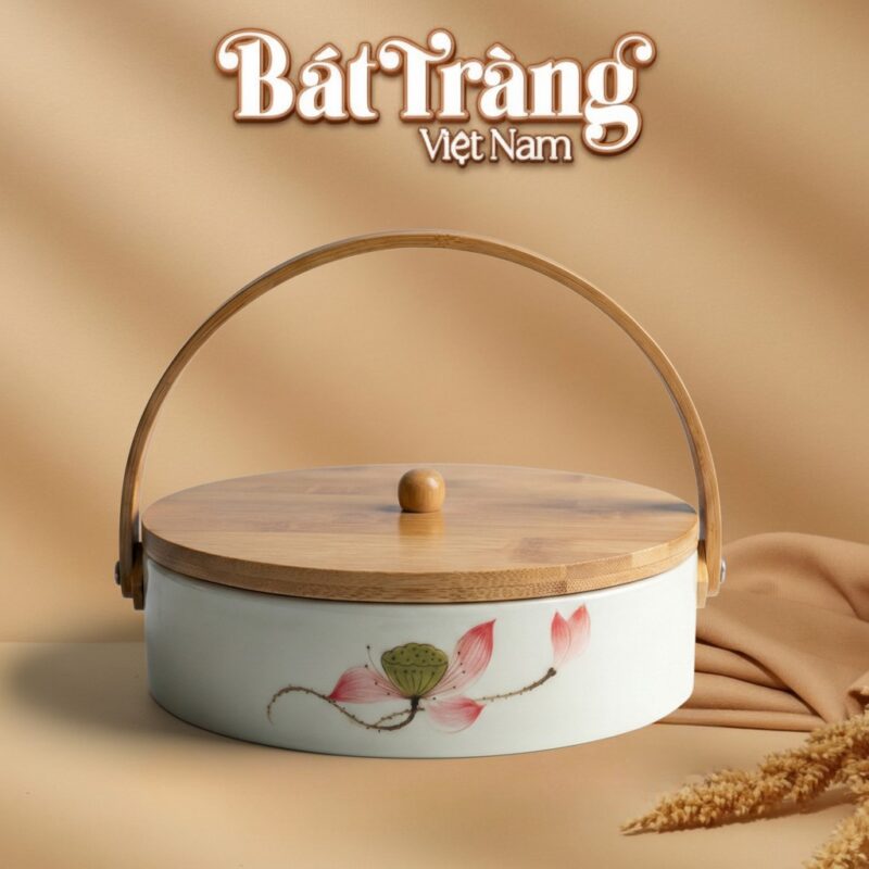 Khay Sứ Đựng Mứt Vẽ Sen Hồng Nắp Gỗ BT-KM25 là một biểu tượng tinh tế, hòa quyện giữa nét truyền thống và hơi thở hiện đại, mang đến vẻ đẹp thanh lịch cho không gian đón Tết của mỗi gia đình. Trong dòng chảy của các sản phẩm khay mứt Bát Tràng, chiếc khay này nổi bật nhờ sự giao thoa hài hòa giữa vẻ đẹp thuần khiết của hoa sen và sự ấm áp mộc mạc từ chất liệu gỗ tự nhiên, biến mỗi khoảnh khắc sum vầy thêm phần trọn vẹn và ý nghĩa.