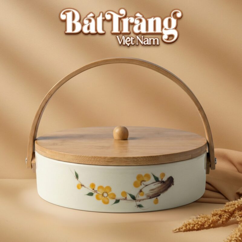 Phần nắp và quai xách được làm từ gỗ tự nhiên, mang đến vẻ ấm áp và gần gũi. Quai xách tiện lợi giúp bạn dễ dàng di chuyển khay đến bất kỳ vị trí nào, đồng thời tô điểm thêm nét duyên dáng cho tổng thể thiết kế. Sự kết hợp giữa gốm sứ và gỗ tạo nên một phong cách Á Đông thanh lịch, phù hợp với nhiều không gian nội thất, từ cổ điển đến hiện đại.