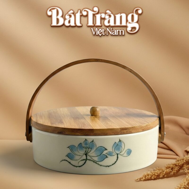 Sản phẩm nổi bật với sự hài hòa về chất liệu và công năng. Thân khay được chế tác từ gốm sứ cao cấp của Bát Tràng, nung ở nhiệt độ chuẩn để đảm bảo độ bền, an toàn cho sức khỏe và giữ được vẻ đẹp vượt thời gian. Sự kết hợp với nắp và quai xách bằng gỗ tự nhiên mang đến vẻ ngoài độc đáo, mộc mạc cùng tính tiện dụng cao.