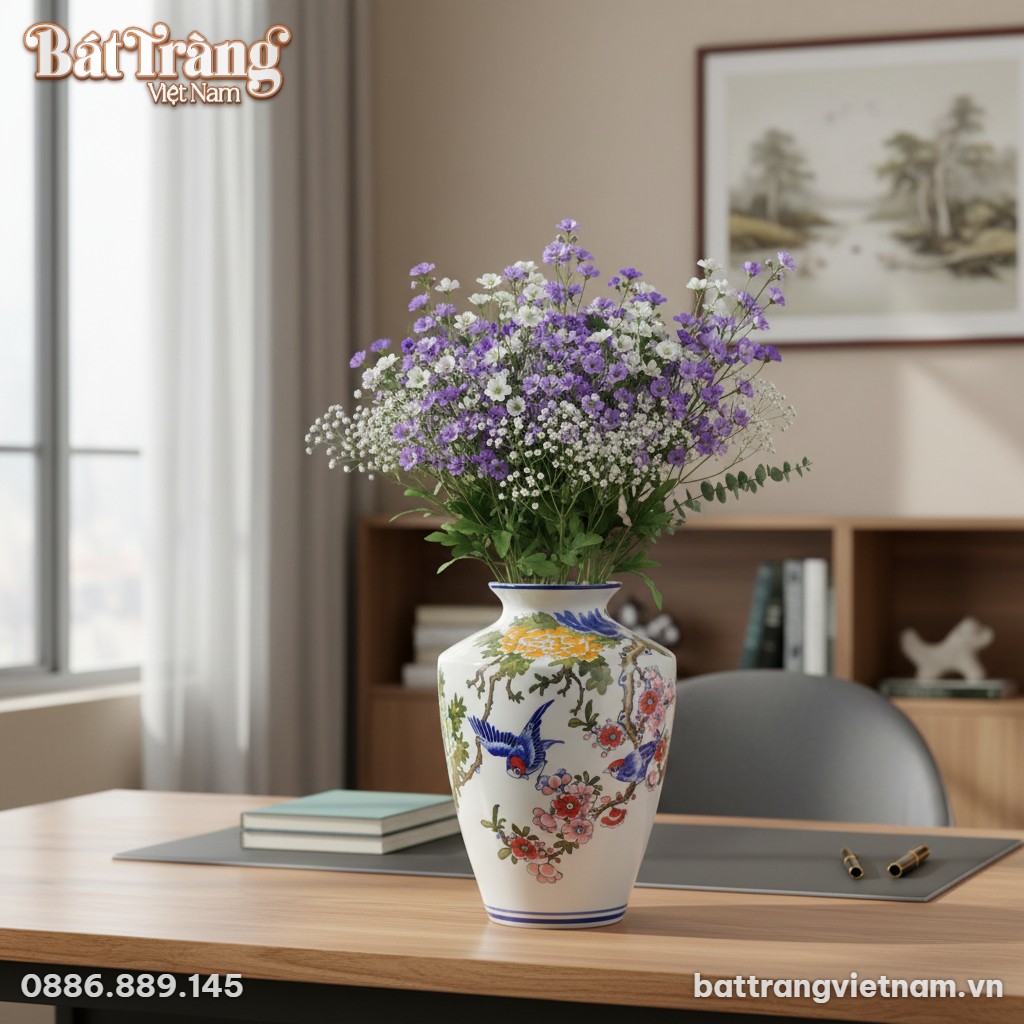Được chế tác từ chất liệu gốm sứ Bát Tràng cao cấp, nung ở nhiệt độ chuẩn, chiếc bình này sở hữu vẻ đẹp trường tồn cùng độ bền bỉ đáng kinh ngạc. Chất liệu gốm sứ đặc trưng của Bát Tràng đảm bảo bình không thấm nước, an toàn tuyệt đối cho sức khỏe và dễ dàng vệ sinh. Đây là sự lựa chọn hoàn hảo để cắm hoa tươi, giữ cho hoa luôn tươi lâu, đồng thời còn là một món đồ decor cao cấp, khẳng định gu thẩm mỹ tinh tế của gia chủ.