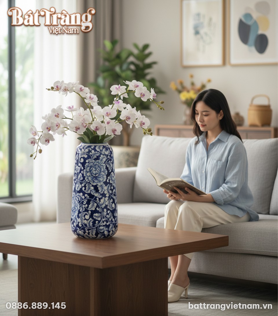 Chiếc bình hoa này nổi bật với nước men lam trắng truyền thống, một biểu tượng của sự thanh lịch và vẻ đẹp cổ điển trong nghệ thuật gốm sứ. Nền men trắng sứ tinh khiết làm nổi bật từng đường nét của họa tiết hoa mẫu đơn và dây lá được vẽ tay thủ công một cách tinh xảo. Đây là một đại diện tiêu biểu cho dòng lọ hoa gốm sứ Bát Tràng, nơi mỗi sản phẩm kể một câu chuyện về sự khéo léo và tâm huyết của người nghệ nhân.