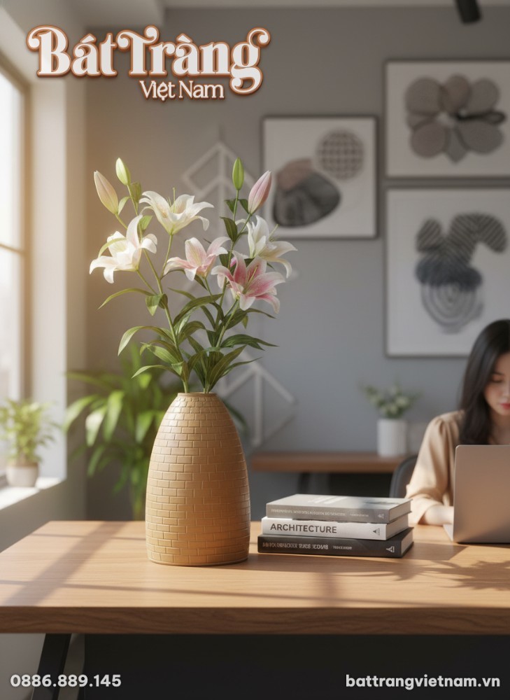 Trong các sản phẩm lọ hoa của Gốm Bát Tràng Việt Nam, mẫu lọ hoa dáng chuông này mang trong mình ‘linh hồn’ của sự mạnh mẽ và tinh tế, lấy cảm hứng từ vẻ đẹp vững chãi của vật liệu xây dựng và sự tỉ mỉ trong từng đường nét gạch khối.
