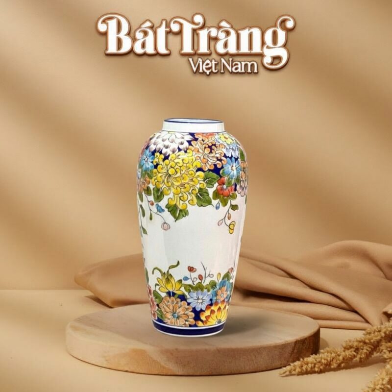 Lọ hoa gốm sứ vẽ họa tiết hoa cúc và hoa lá đa sắc BT-LH23 là biểu tượng của sự sống động và tinh tế, một điểm nhấn không thể thiếu trong bộ sưu tập bình hoa gốm sứ cao cấp của Gốm Bát Tràng Việt Nam.