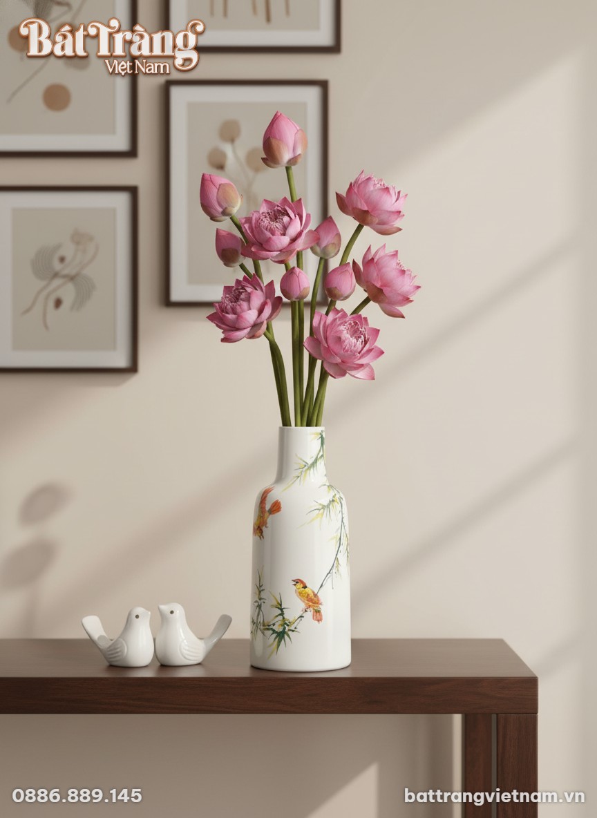 Lọ hoa gốm sứ men trắng vẽ trúc và chim BT-LH24 là một điểm nhấn tinh tế cho bất kỳ không gian nào, mang trong mình vẻ đẹp truyền thống và hơi thở của thiên nhiên.