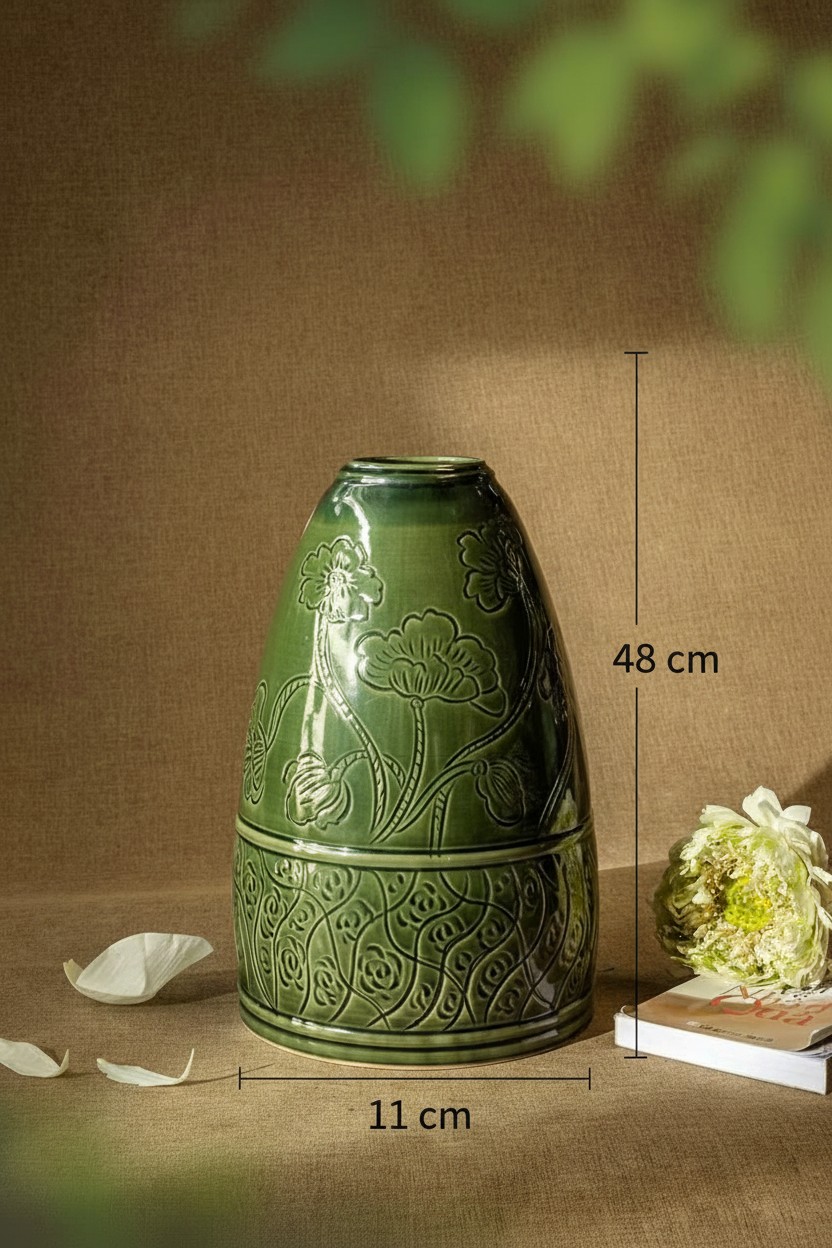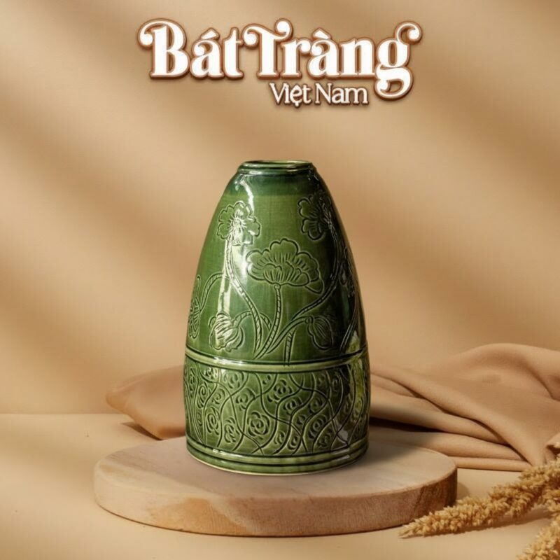 Chiếc lọ hoa dáng chuông này là minh chứng rõ nét cho sự kỳ công đó. Từ chất liệu gốm sứ Bát Tràng cao cấp đến nước men xanh lục bảo óng ả, mọi chi tiết đều được chăm chút để tạo nên một kiệt tác xứng đáng được đầu tư và sưu tầm.