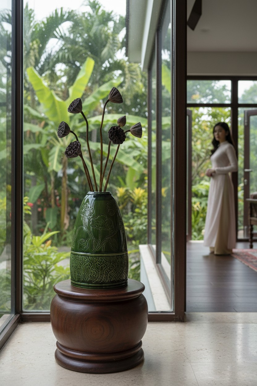- Màu sắc độc đáo: Men xanh lục bảo (xanh ngọc) sang trọng, tạo hiệu ứng thị giác mê hoặc và chiều sâu cho từng đường nét chạm khắc.