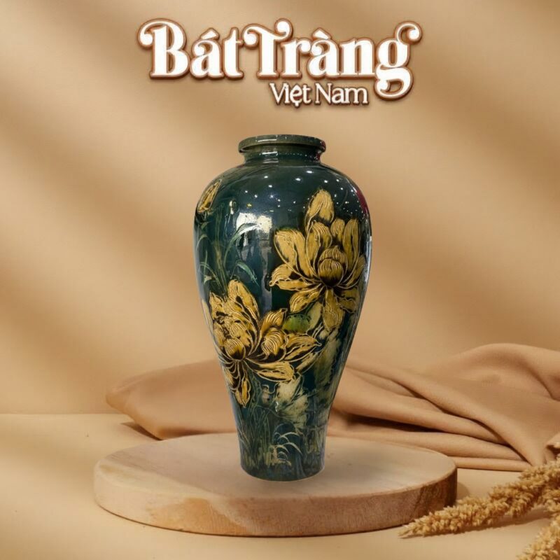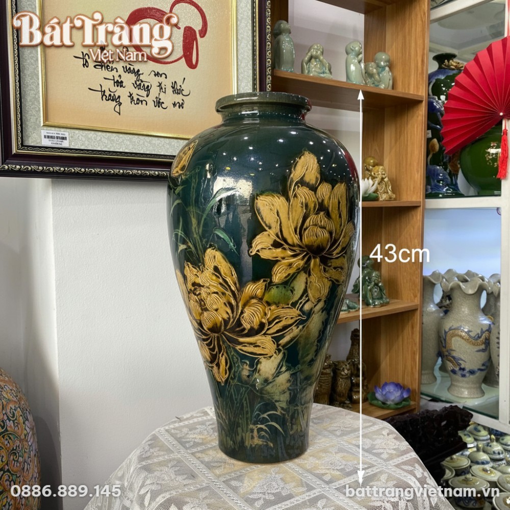 Lọ hoa gốm sứ dáng đùi dế men rêu vẽ hoa sen vàng BT-LH56 sở hữu chiều cao 43cm cùng màu sắc xanh rêu sâu lắng, mang đậm dấu ấn của dòng gốm sứ Bát Tràng di sản. Từng nhành sen vàng vẽ nổi thủ công trên thân bình là biểu tượng của sự thanh khiết, giúp kiến tạo một không gian sống đầy tính nghệ thuật và chiều sâu văn hóa.