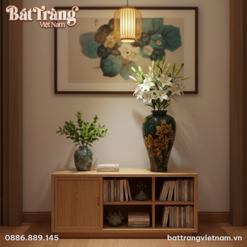 Quá trình nung luyện ở nhiệt độ 1200 độ C giúp cốt gốm đanh chắc và bền bỉ theo năm tháng. Bề mặt men bóng mịn bảo vệ các họa tiết đồng thời tạo hiệu ứng phản chiếu ánh sáng tinh tế, giúp chiếc lọ trở nên sang quý và nổi bật dù đặt ở bất kỳ vị trí nào.