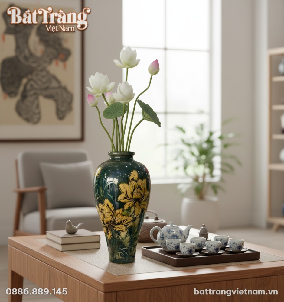 Trong phong thủy, hoa sen vàng biểu trưng cho sự thuần khiết, phú quý và an lạc. Việc bài trí lọ hoa Bát Tràng vẽ tay trong nhà giúp lan tỏa vượng khí, đồng thời thể hiện phong thái nhã nhặn cùng gu thẩm mỹ chiều sâu của người sở hữu.
