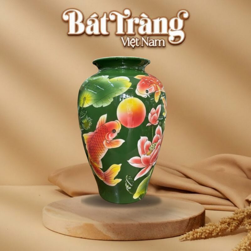 Lọ hoa dáng vò miệng loe hoạ tiết sen cá BT-LH104 là một tuyệt tác nghệ thuật từ làng nghề gốm sứ Bát Tràng, nơi tinh hoa thủ công truyền thống được gìn giữ và phát triển qua nhiều thế kỷ. Chiếc lọ hoa này không chỉ là vật phẩm trang trí đơn thuần mà còn là một biểu tượng phong thủy mạnh mẽ, mang đến sự thịnh vượng, tài lộc và bình an cho không gian sống của gia chủ.
