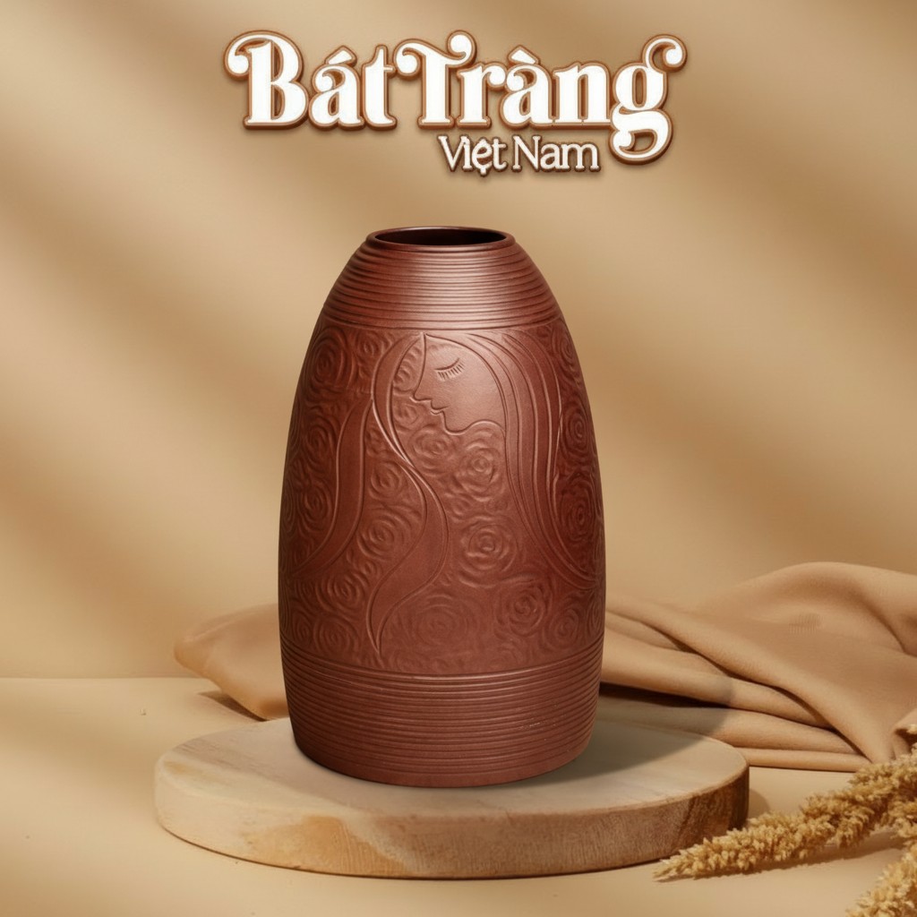 Lọ hoa dáng chuông hoạ tiết cô gái men nâu trầm Bát Tràng là minh chứng cho sự sáng tạo không ngừng của người nghệ nhân Bát Tràng, khi biết cách kết hợp hài hòa giữa giá trị truyền thống và hơi thở đương đại.