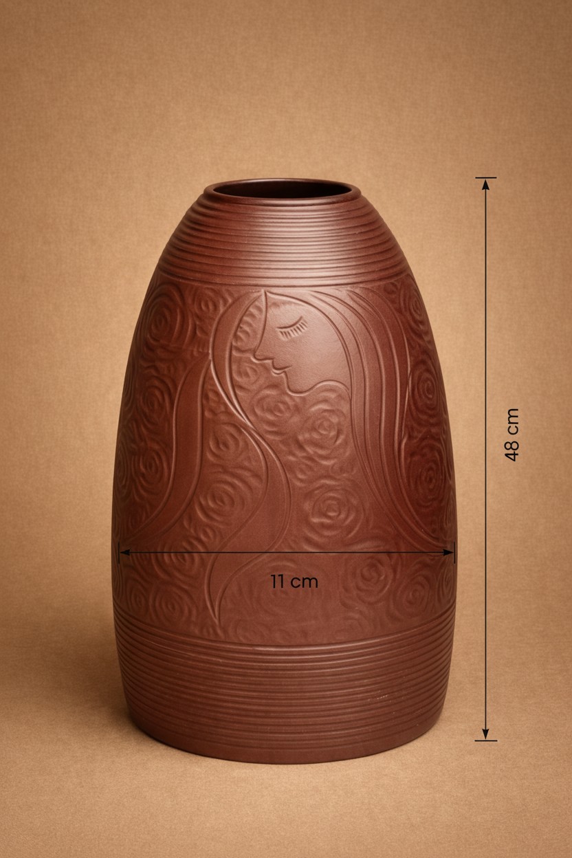 Điểm nhấn làm nên giá trị độc bản của lọ hoa Bát Tràng là họa tiết người phụ nữ và hoa hồng được chạm nổi tinh xảo. Đây không chỉ là một bức tranh mà là một câu chuyện về sự nữ tính, duyên dáng và vẻ đẹp vượt thời gian, gợi lên cảm xúc về sự bình yên và lãng mạn.