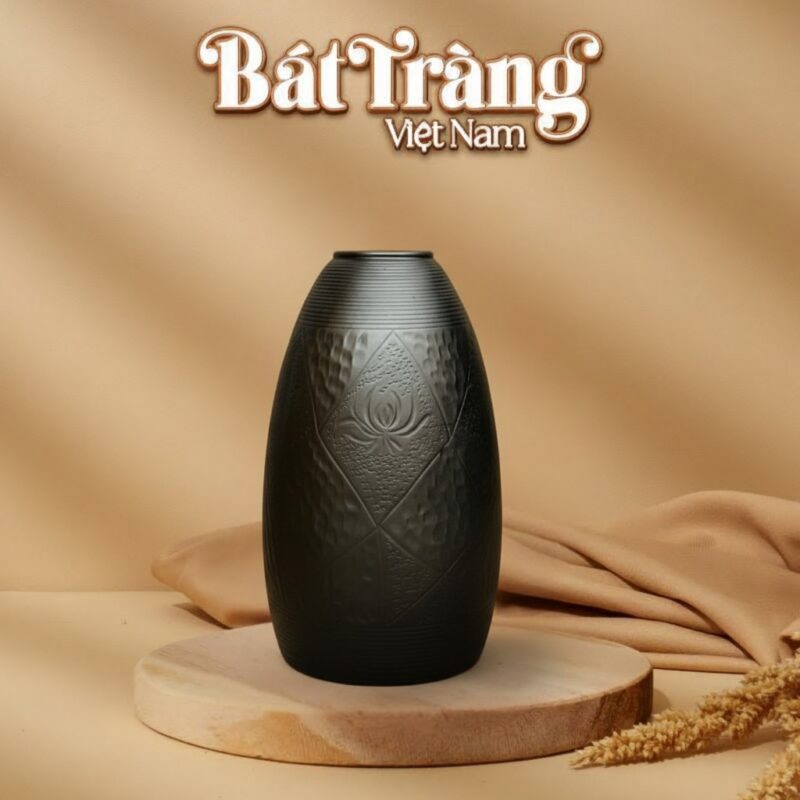 Từ những vân sần mạnh mẽ, hình học kim cương sắc nét đến hoa sen/lá cách điệu mềm mại ở thân, cùng vân sọc ngang ở cổ và chân lọ – mỗi chi tiết đều được các nghệ nhân Bát Tràng tỉ mỉ khắc họa, tạo nên một tổng thể hài hòa và đầy cuốn hút.
