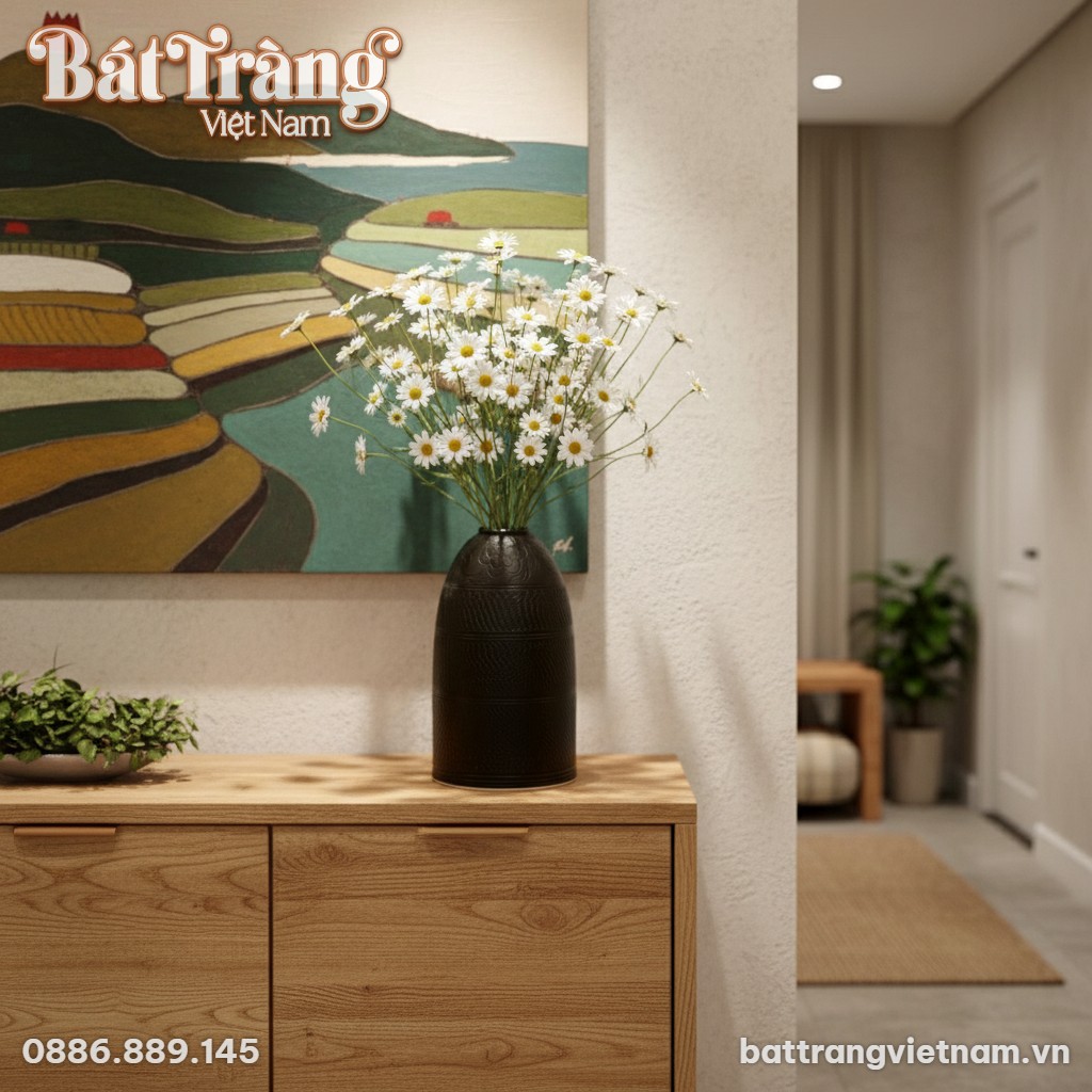 Với vẻ đẹp trầm mặc và tinh tế, lọ hoa này là lựa chọn hoàn hảo cho những gia chủ yêu thích phong cách nội thất tối giản, hiện đại, đề cao giá trị thủ công và sự độc đáo. Sản phẩm không chỉ là một vật trang trí đơn thuần mà còn là một tuyên ngôn về gu thẩm mỹ, biến không gian sống trở thành một bức tranh tĩnh vật đầy cảm xúc.