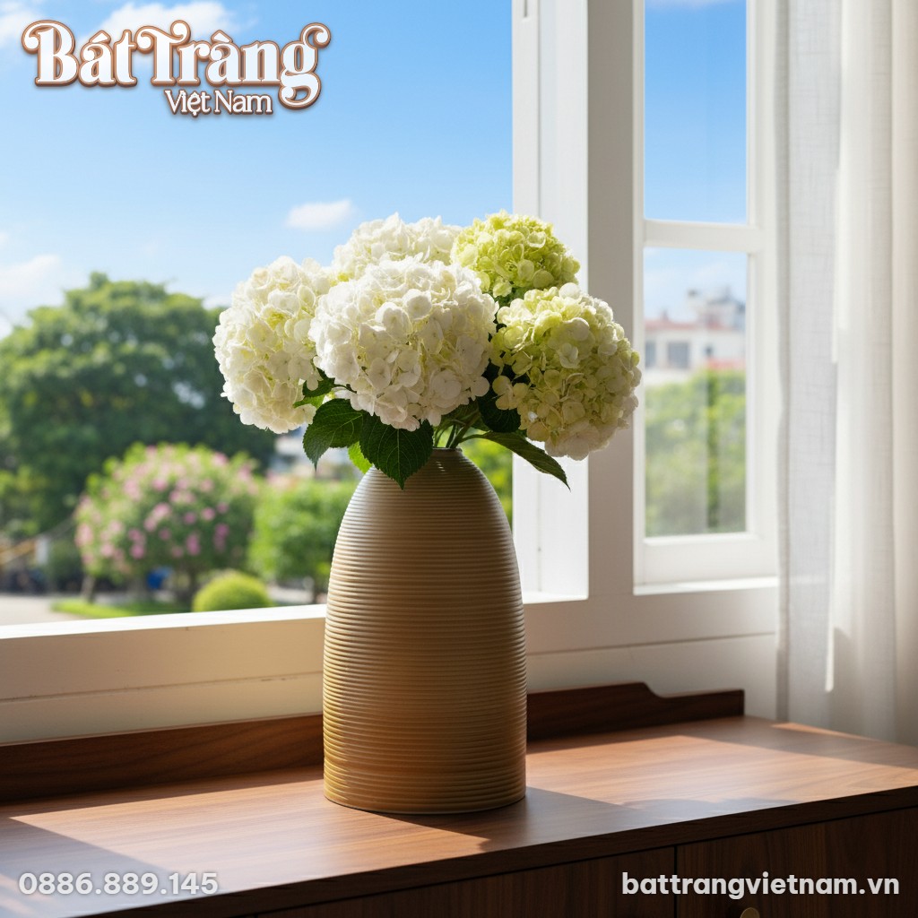 Mẫu bình hoa gốm sứ Bát Tràng này kết hợp giữa kỹ thuật chế tác gốm thủ công cùng thiết kế thanh lịch, giúp người dùng tạo nên góc nhìn tinh tế ngay trong chính ngôi nhà của mình.