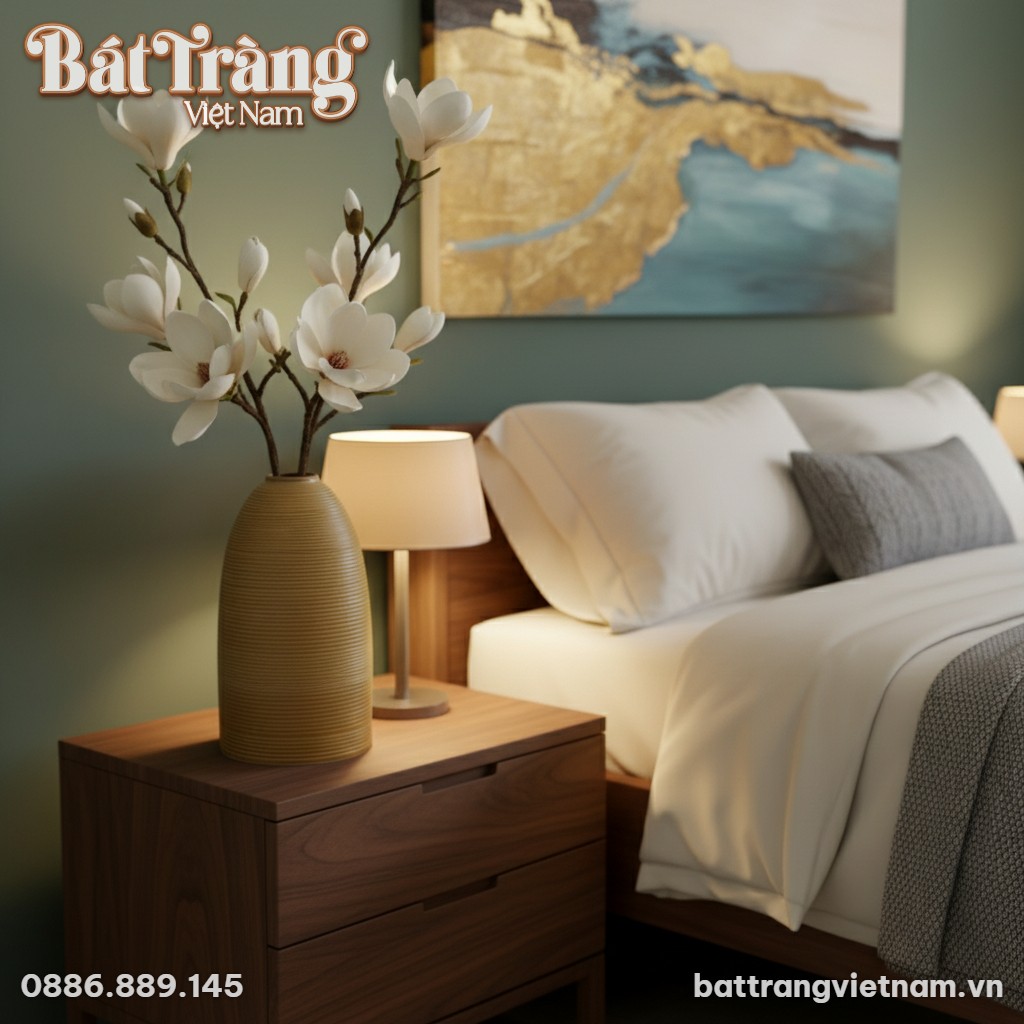 Sắc màu này gợi liên tưởng đến phù sa và nắng chiều, mang lại sự cân bằng năng lượng cho căn phòng. Chất liệu gốm mộc tĩnh lặng giúp không gian trở nên hài hòa, dễ chịu, rất phù hợp với phong cách kiến trúc tối giản hoặc các căn hộ mang xu hướng tự nhiên.