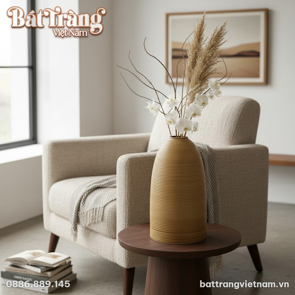 - Phòng khách và bàn console: Đặt bình tại các vị trí trung tâm để thu hút ánh nhìn nhờ kích thước lớn. Sắc vàng mật giúp không gian tiếp khách thêm phần trang trọng và ấm cúng.