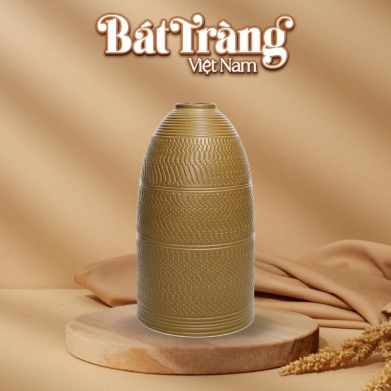 Điểm nhấn trên thân bình là những dải vân hạt được chạm khắc tay nhịp nhàng, tạo nên hiệu ứng thị giác đa chiều. Những vết chạm khắc khéo léo giúp bề mặt gốm trở nên sinh động, mang lại sức hút riêng biệt cho vật phẩm trưng bày mà không cần đến những màu sắc quá rực rỡ.