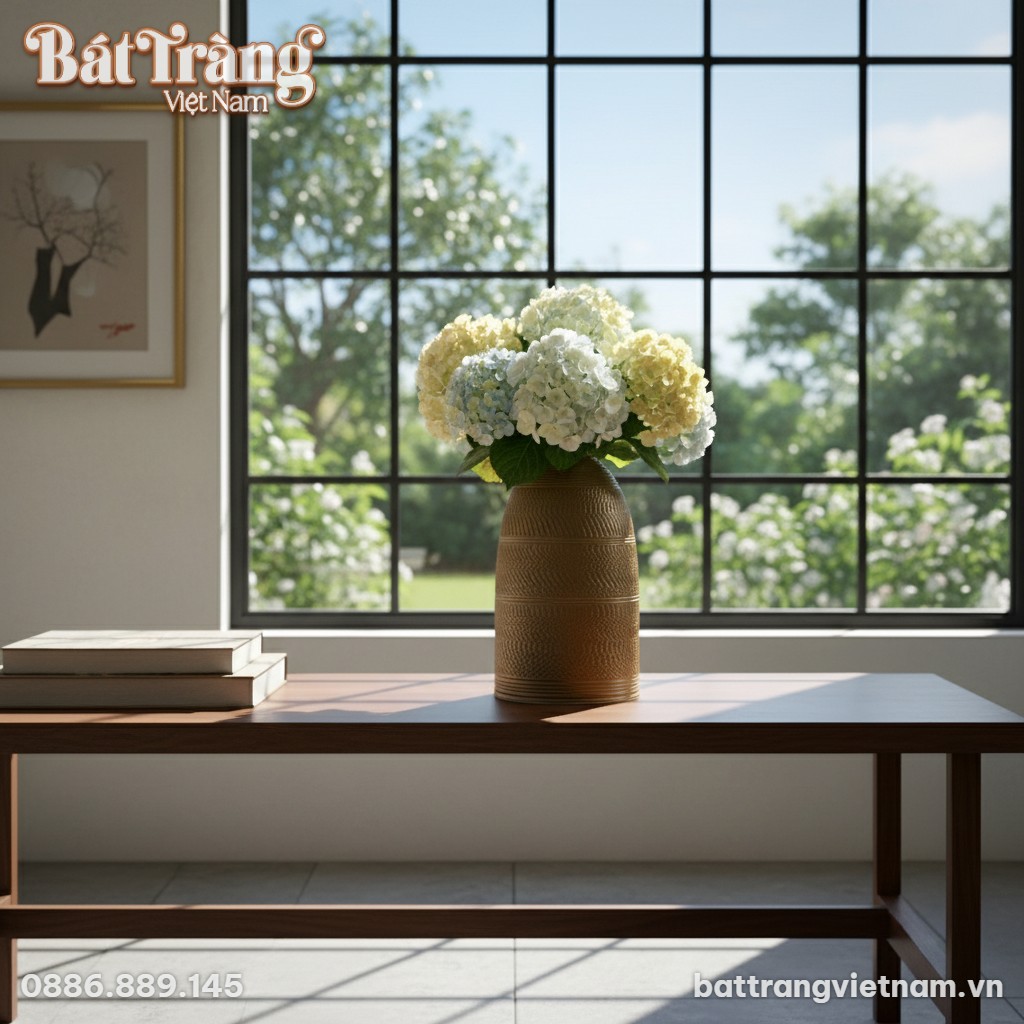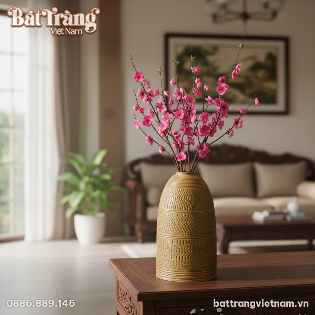 - Phòng khách và kệ trang trí: Đặt bình tại bàn console hoặc kệ tivi giúp không gian thêm phần trang trọng. Chiều cao 52cm cùng sắc men mộc giúp sản phẩm thu hút ánh nhìn nhưng vẫn giữ được sự ấm áp cho nơi tiếp khách.