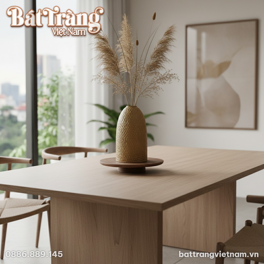 - Phòng khách và bàn console: Đặt bình tại vị trí trung tâm hoặc kệ tivi để thu hút ánh nhìn nhờ chiều cao 52cm bề thế. Sắc vàng nâu giúp không gian tiếp khách thêm phần sang trọng và ấm cúng.