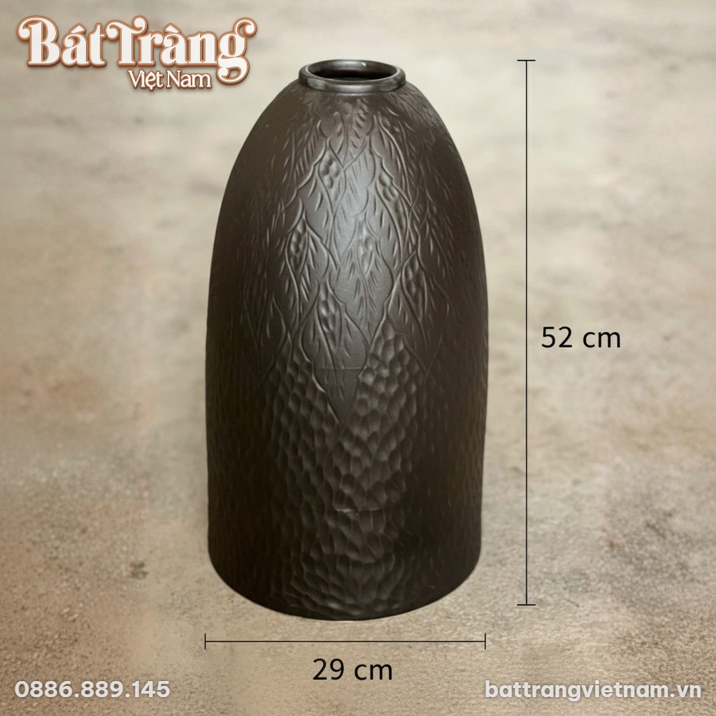 Bình hoa gây ấn tượng bởi phom dáng chuông thanh lịch với chiều cao 52cm cùng đường kính đáy 29cm, tạo thế đứng vững chãi tại các vị trí trưng bày lớn. Thiết kế thuôn nhẹ về phía miệng giúp sản phẩm dễ dàng làm chủ không gian, từ những căn phòng tối giản hiện đại đến các ngôi nhà mang phong cách Á Đông truyền thống.