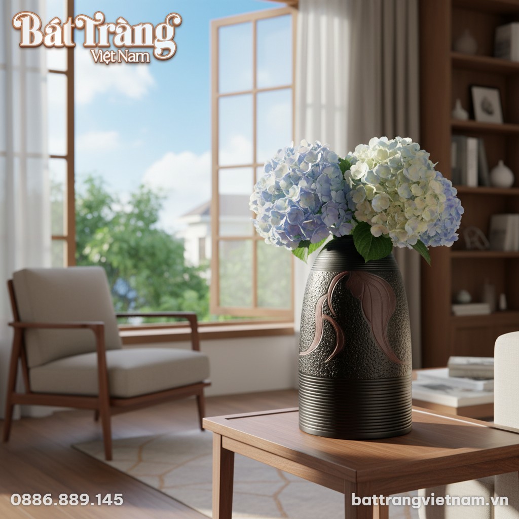 - Tại phòng khách và sảnh chờ: Đặt bình hoa trên kệ tivi hoặc bàn console để thu hút ánh nhìn. Chiều cao 52cm cùng sắc nâu đen giúp sản phẩm kiến tạo vẻ sang trọng nhưng vẫn giữ được sự ấm cúng cho ngôi nhà.