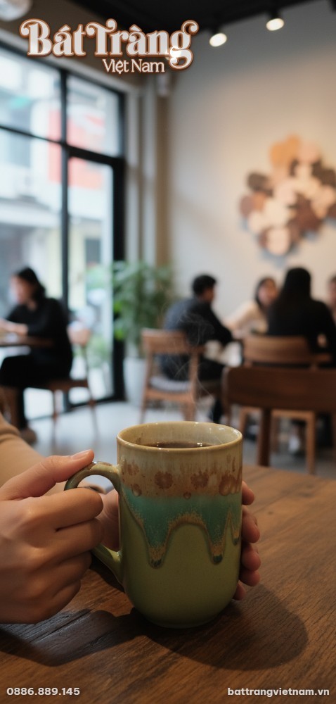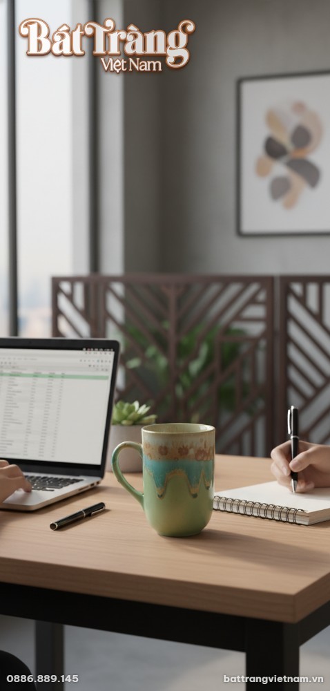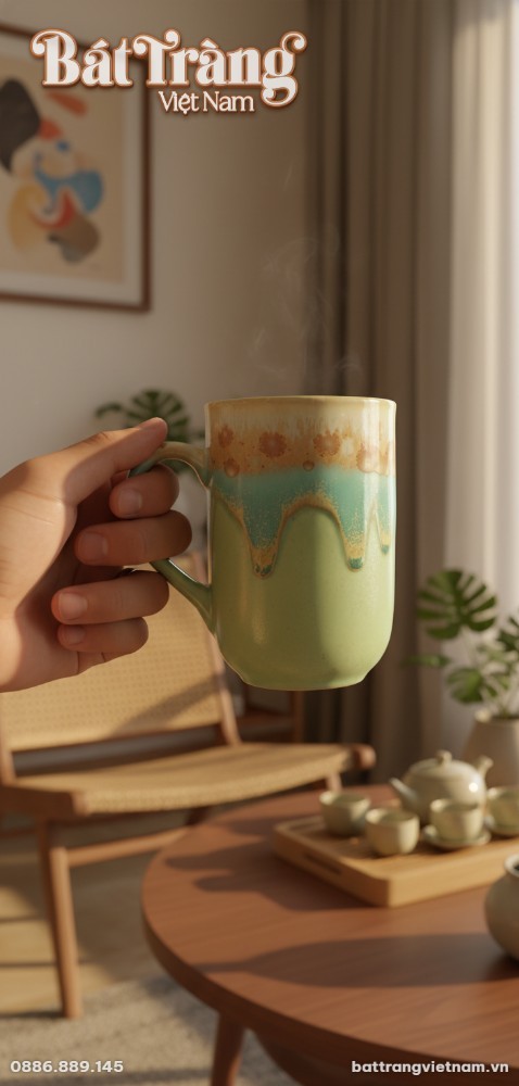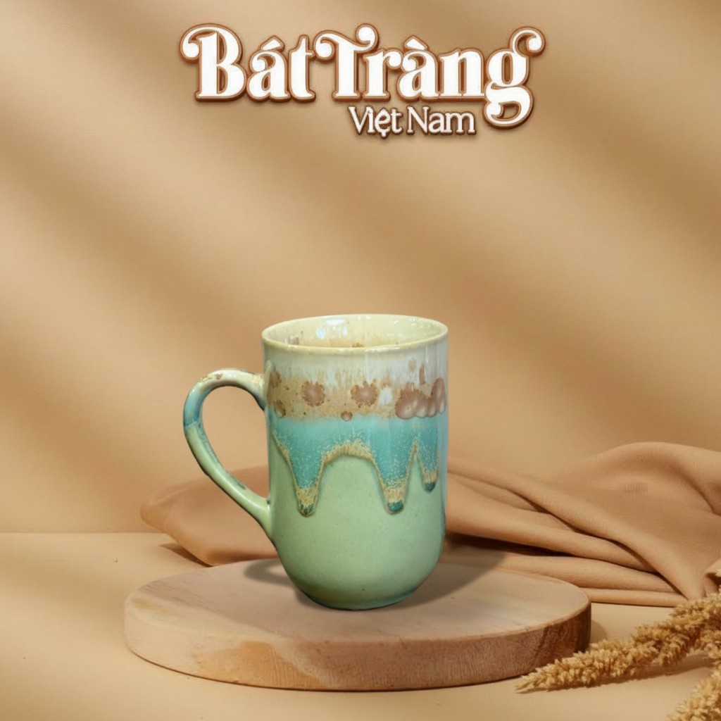 Vẻ đẹp của chiếc cốc sứ đến từ kỹ thuật men chảy thủ công tinh xảo, một đặc trưng làm nên giá trị của gốm sứ Bát Tràng. Sự kết hợp ngẫu hứng giữa ba gam màu: sắc kem nhẹ nhàng ở vành cốc, lớp men xanh ngọc và xanh lá tươi mát chảy tràn xuống, xen kẽ những vệt nâu đất tự nhiên, tạo nên một hiệu ứng thị giác đầy mê hoặc. Mỗi đường vân, mỗi giọt men chảy đều là duy nhất, đảm bảo rằng không có hai chiếc cốc nào giống hệt nhau, mang đến cho bạn một tác phẩm nghệ thuật độc bản.