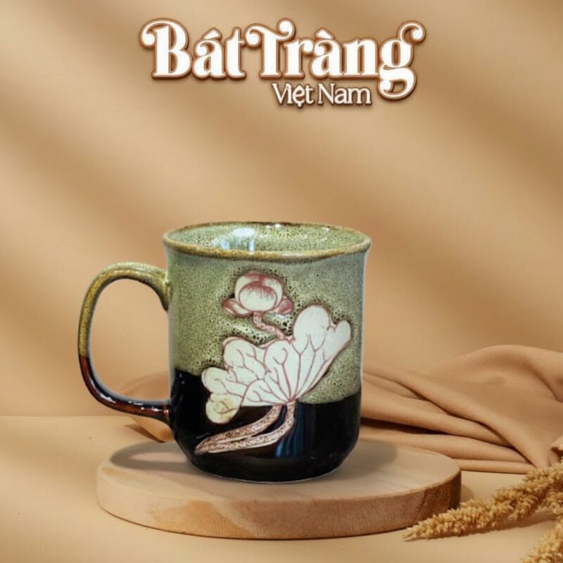 Đối với ly sứ Bát Tràng, những sản phẩm được phủ men hỏa biến luôn có một sức hút đặc biệt. Chiếc cốc sứ hoạ tiết hoa sen này là một minh chứng rõ nét cho kỹ thuật chế tác men chuyển màu đỉnh cao của người thợ Bát Tràng. Phần thân trên của cốc được phủ một lớp men xanh rêu mộc mạc, có độ sần nhẹ, gợi nhớ đến vẻ đẹp tự nhiên của đất trời.
