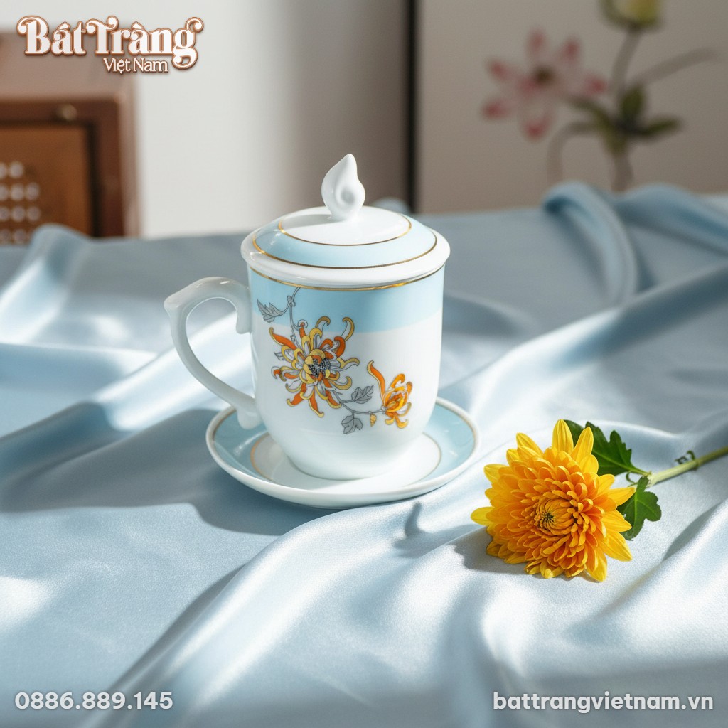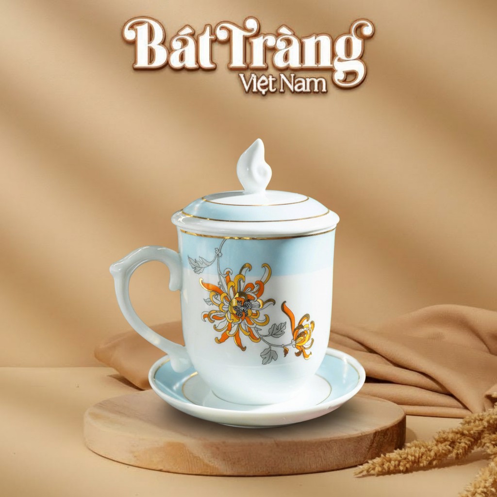 Ly Sứ Có Nắp Và Đĩa Lót Họa Tiết Hoa Cúc Vàng Cam Viền Vàng Kim BT-QT83 là một lựa chọn tinh tế, mang đến sự hòa quyện hoàn hảo giữa nét đẹp truyền thống và hơi thở hiện đại trong từng khoảnh khắc thưởng trà.