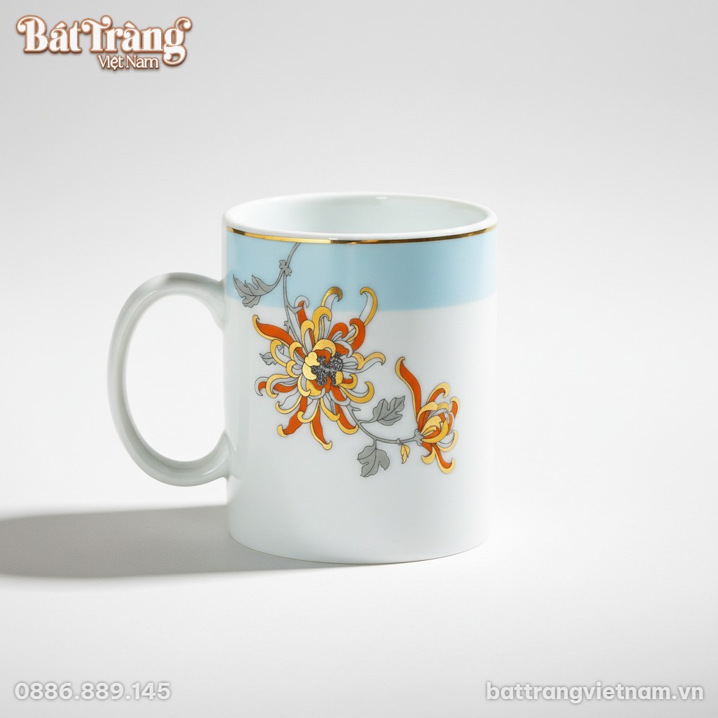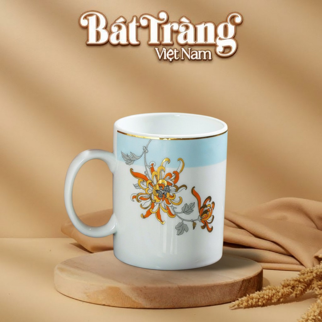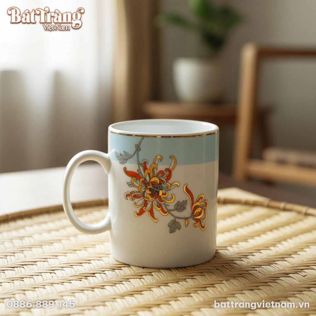 Chiếc ly sứ này thu hút mọi ánh nhìn bởi thiết kế độc đáo, là minh chứng cho sự tài hoa của nghệ nhân Bát Tràng. Nền men trắng tinh khôi là bức canvas hoàn hảo để tôn vinh họa tiết hoa cúc.