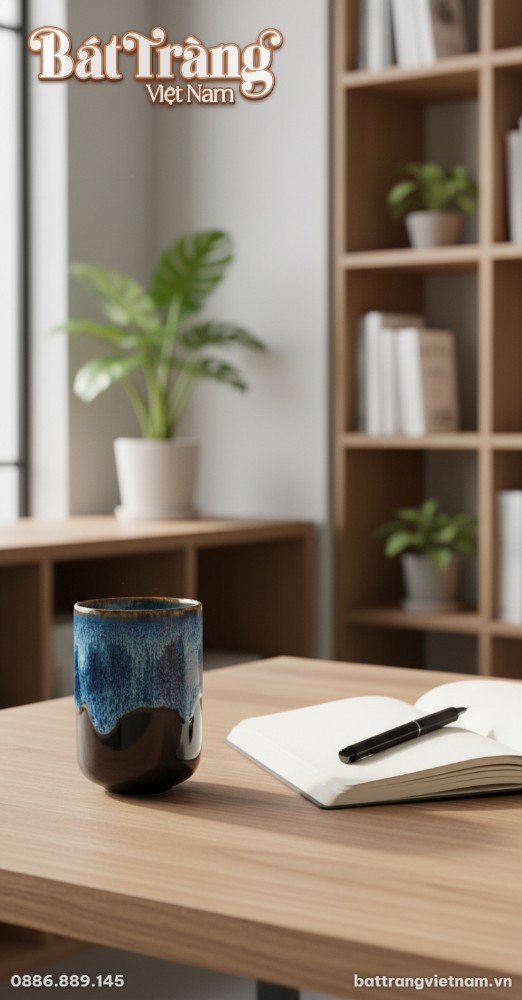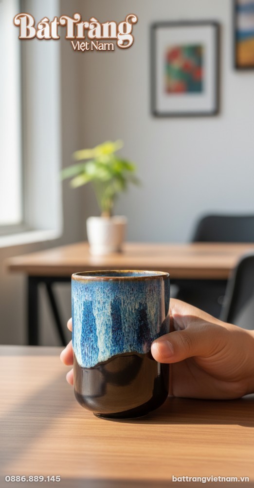 Cốc sứ Bát Tràng men hoả biến dáng trụ không quai BT-LS33 là sự kết hợp hoàn hảo giữa kỹ thuật nung nấu truyền thống và phong cách thiết kế hiện đại, tối giản. Sản phẩm gây ấn tượng mạnh bởi sắc xanh sâu thẳm hòa quyện cùng các vân men tự nhiên, tạo nên một diện mạo độc đáo và không trùng lặp trên từng thân cốc. Với kiểu dáng hình trụ gọn gàng và lược bỏ phần quai cầm, mẫu ly sứ này mang lại cảm giác chắc chắn, vừa vặn trong lòng bàn tay, rất phù hợp để thưởng thức trà, cà phê hoặc làm quà tặng ý nghĩa.
