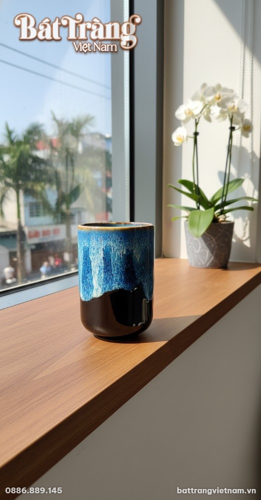 Điểm nhấn làm nên giá trị của cốc sứ Bát Tràng men hoả biến dáng trụ không quai BT-LS33 chính là kỹ thuật men chảy (men biến) độc đáo. Lớp men xanh dương và trắng đầy mê hoặc chảy tràn trên nền men nâu đen bóng, tạo nên hiệu ứng như một thác nước thu nhỏ, sống động và đầy cuốn hút. Sự biến hóa ngẫu nhiên trong quá trình nung ở nhiệt độ cao đã tạo ra những đường vân, mảng màu không trùng lặp, biến mỗi chiếc cốc thành một tuyệt tác nghệ thuật độc nhất vô nhị.