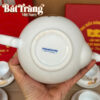 Bộ ấm chén in logo được làm từ nguồn đất sét tinh lọc của làng nghề Bát Tràng, trải qua quy trình nung ở nhiệt độ trên 1200°C. Quá trình này giúp cốt gốm trở nên bền chắc và loại bỏ hoàn toàn các tạp chất độc hại.