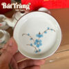 Cận cảnh họa tiết hoa đào xanh được vẽ thủ công tỉ mỉ trên nền trắng của bộ trà